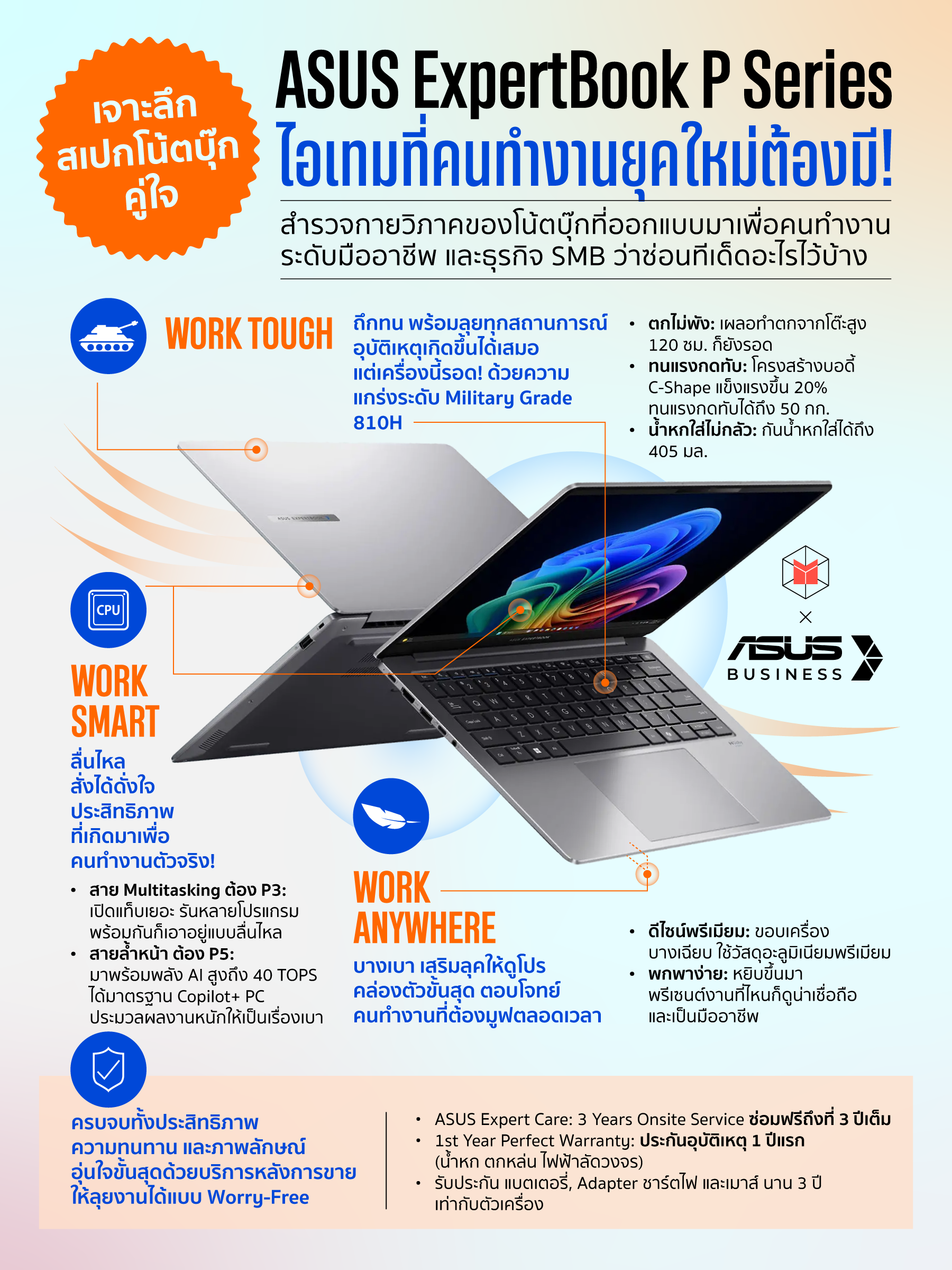 เพื่อเป็นการตอกย้ำความเป็นแบรนด์ที่คนทำงานและเจ้าของธุรกิจ SME สามารถวางใจได้แบบ Worry-Free ASUS ยังปิดท้ายด้วยบริการหลังการขาย ASUS Expert Care ที่ให้อุ่นใจขั้นสุด ไม่ว่าจะเป็น 3 Years Onsite Service บริการซ่อมฟรีถึงที่โดยช่างมืออาชีพนาน 3 ปี และ 1st Year Perfect Warranty ประกันอุบัติเหตุ 1 ปีแรก ที่ครอบคลุมตั้งแต่น้ำหกใส่ ไฟฟ้าลัดวงจร ไปจนถึงการตกหล่น และที่สำคัญยังมีรับประกัน แบตเตอรี่, Adapter ชาร์ตไฟ และเมาส์ นาน 3 ปี เท่ากับตัวเครื่องอีกด้วย