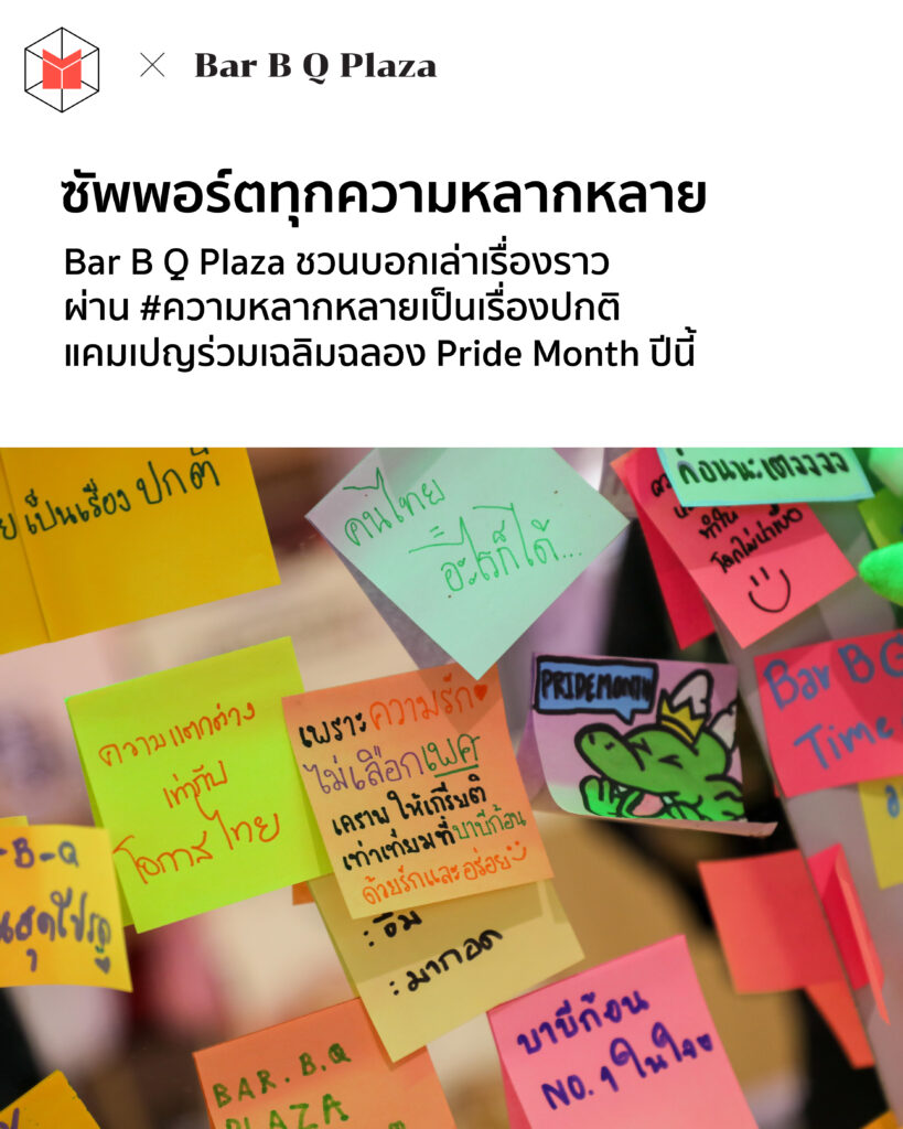 แน่นอนว่าบรรยากาศสดใสในเทศกาล Pride Month แบบนี้ หลายแบรนด์ย่อมปล่อยแคมเปญดีๆ ออกมาเพื่อร่วมสนับสนุนความหลากหลายในแบบของตัวเอง เช่นเดียวกับ Bar B Q Plaza ที่ไม่เพียงอยากชวนทุกคนร่วมเฉลิมฉลอง แต่ยังอยากชวนทุกคนจุดประกายความภาคภูมิใจในตัวเองผ่านแคมเปญ ‘ความหลากหลายเป็นเรื่องปกติ’ ที่นอกจากจะเป็นการแสดงการสนับสนุนความหลากหลายในทุกมิติของ Bar B Q Plaza เองแล้ว ยังเปิดพื้นที่ให้ทุกคนได้สะท้อนตัวตนและบอกเล่าเรื่องราวความหลากหลายของตัวเอง ผ่านกิจกรรม ‘เขียนสะท้อนความหลากหลาย’ ที่ Bar B Q Plaza สาขาเซ็นทรัล ลาดพร้าว ซึ่งเปิดกว้างให้ทุกคนมีพื้นที่แสดงความเป็นตัวของตัวเอง ส่วนสำหรับคนที่ไม่สะดวกไปแสดงตัวตนแบบ on ground ก็สามารถร่วมแสดงความคิดเห็นทาง online ที่เฟซบุ๊กแฟนเพจ Bar B Q Plaza ได้เช่นเดียวกัน