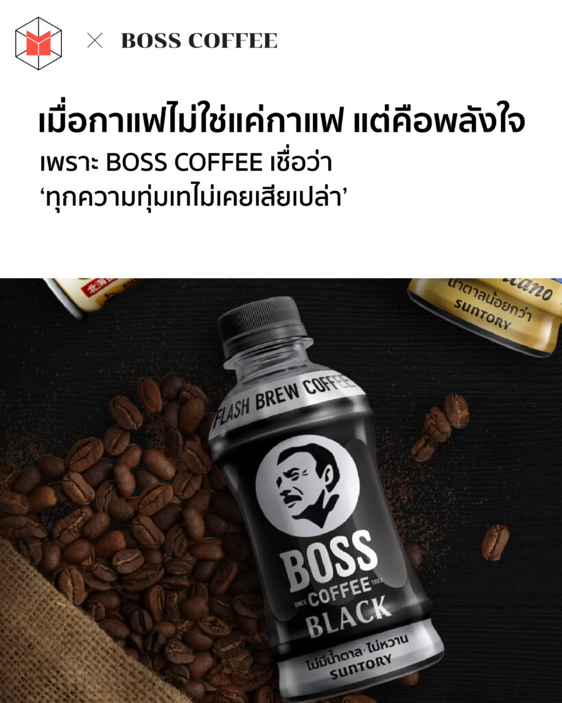 BOSS COFFEE หนึ่งในแบรนด์กาแฟพร้อมดื่มอันดับ 1 จากญี่ปุ่น จึงเลือกจะสื่อสารภาพลักษณ์ของแบรนด์ด้วยการเป็น คู่หูของคนทำงาน ที่พร้อมเคียงข้างและซัพพอร์ตทุกความตั้งใจ ให้กาแฟไม่ใช่แค่กาแฟ แต่คือพลังใจสำคัญที่จะช่วยให้ความทุ่มเทไม่เสียเปล่า จึงเป็นที่มาของแคมเปญ ‘ทุกความทุ่มเทไม่เคยเสียเปล่า’ เพื่อสื่อสารถึงความทุ่มเทในการคัดสรรวัตถุดิบคุณภาพสูง พัฒนารสชาติ และใส่ใจทุกรายละเอียด เพื่อส่งมอบกาแฟที่ดีที่สุดให้กับคนทำงานในหลากหลายอาชีพ