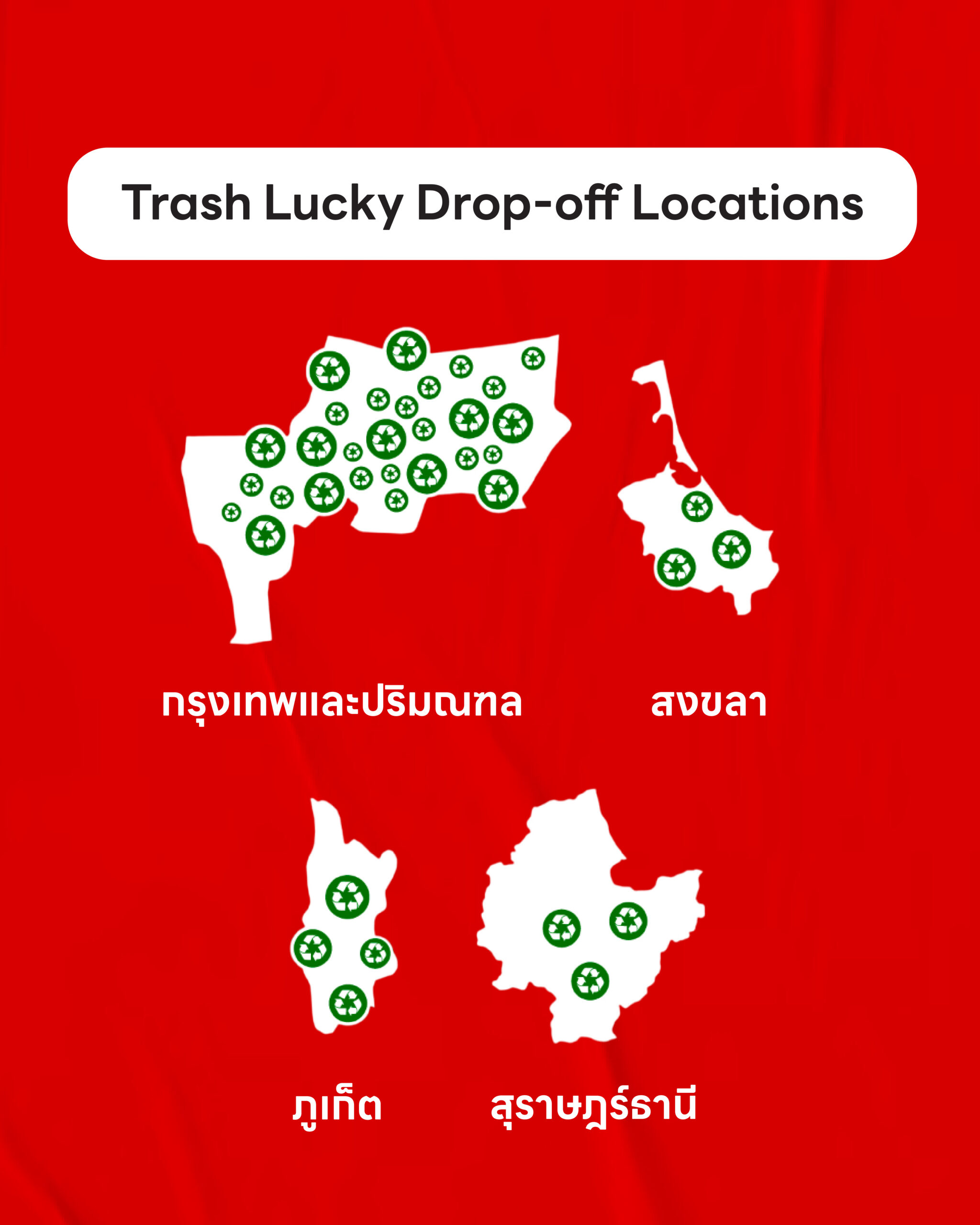 – วิธีที่ 1 นำไปส่งที่จุดรับวัสดุรีไซเคิลรวมกว่า 80 จุด ณ จุดรับวัสดุรีไซเคิลของพันธมิตร คือ บิ๊กซี ซูเปอร์เซ็นเตอร์ 11 สาขา, ห้างสรรพสินค้า โลตัส 15 สาขา, สถานีบริการน้ำมันเชลล์ 29 สาขา, เดอะมอลล์ 4 สาขา, ห้างสรรพสินค้าสยามพารากอน, ศูนย์การค้าจังซีลอน ป่าตอง ภูเก็ต 1 จุด, ท็อปส์ 6 สาขา, GO WHOLESALE 5 สาขา และมหาวิทยาลัย 11 แห่ง โดยสามารถดูรายละเอียดได้ที่เว็บไซต์ https://trashlucky.com/recycleme/