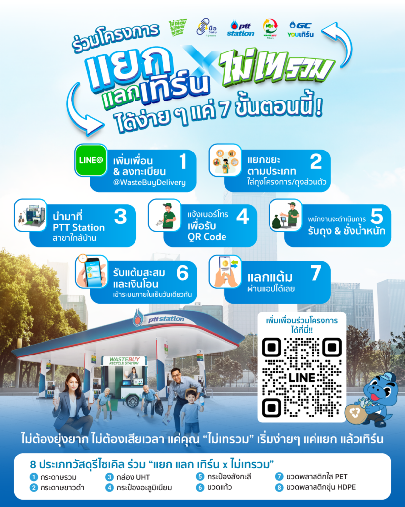โดยเพิ่มความสะดวกในการคัดแยกขยะ ผ่านจุดรับวัสดุรีไซเคิล 8 ชนิด ภายในสถานีบริการ PTT Station 10 แห่งทั่วกรุงเทพฯ ซึ่งนอกจากจะได้แต้มจากการขายวัสดุรีไซเคิลแล้ว ยังช่วยลดค่าธรรมเนียมเก็บขยะของกทม. จาก 60 บาท เหลือ 20 บาทต่อเดือนอีกด้วย