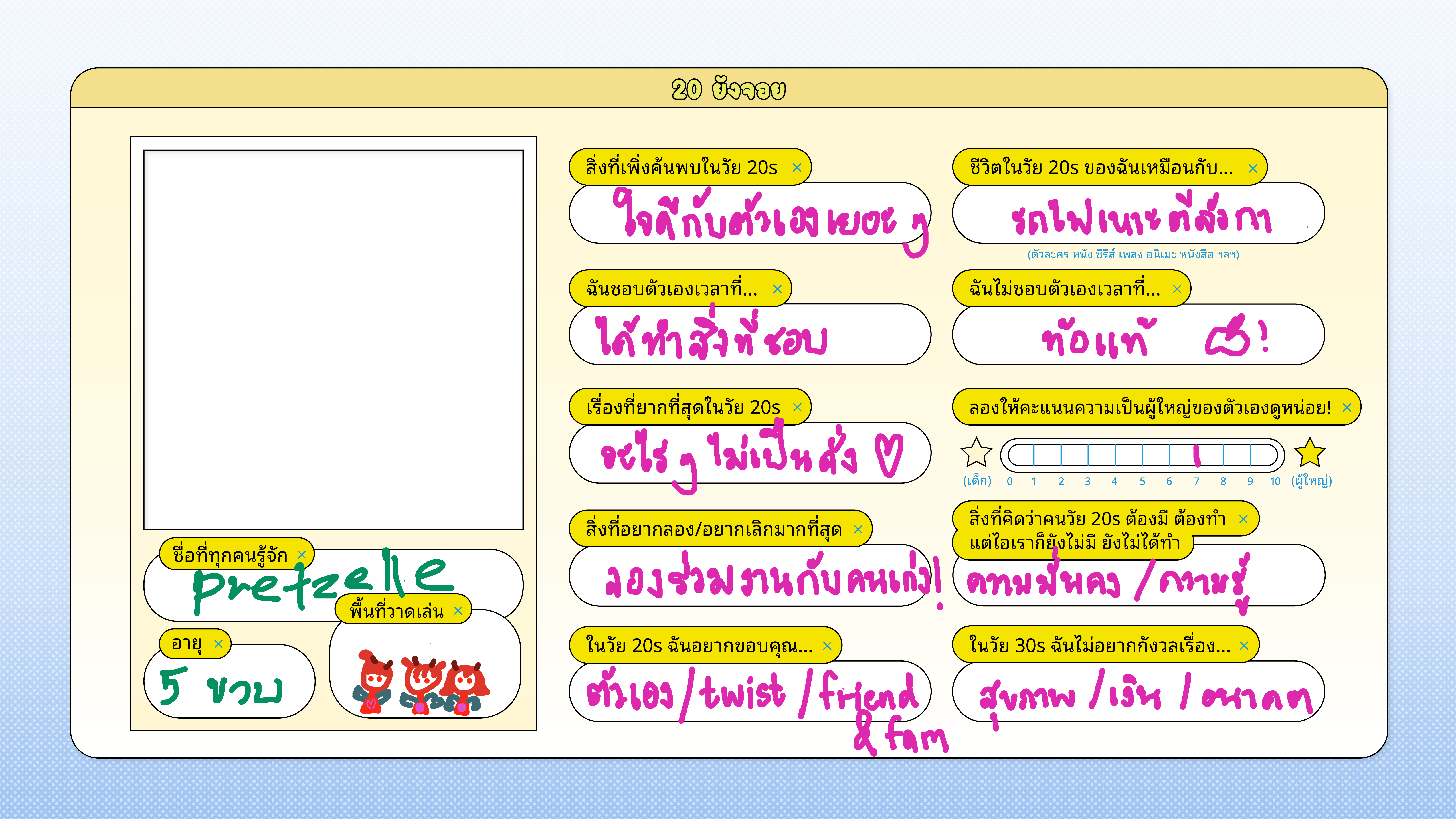 “แขกรับเชิญคนอื่นเคยตอบว่ายังไม่อยากโต ยังอยากเรียนรู้ ยังไม่ได้กินข้าว สำหรับ PRETZELLE จะตอบว่า… ยังอะไรดีครับ” เราชวนคุย