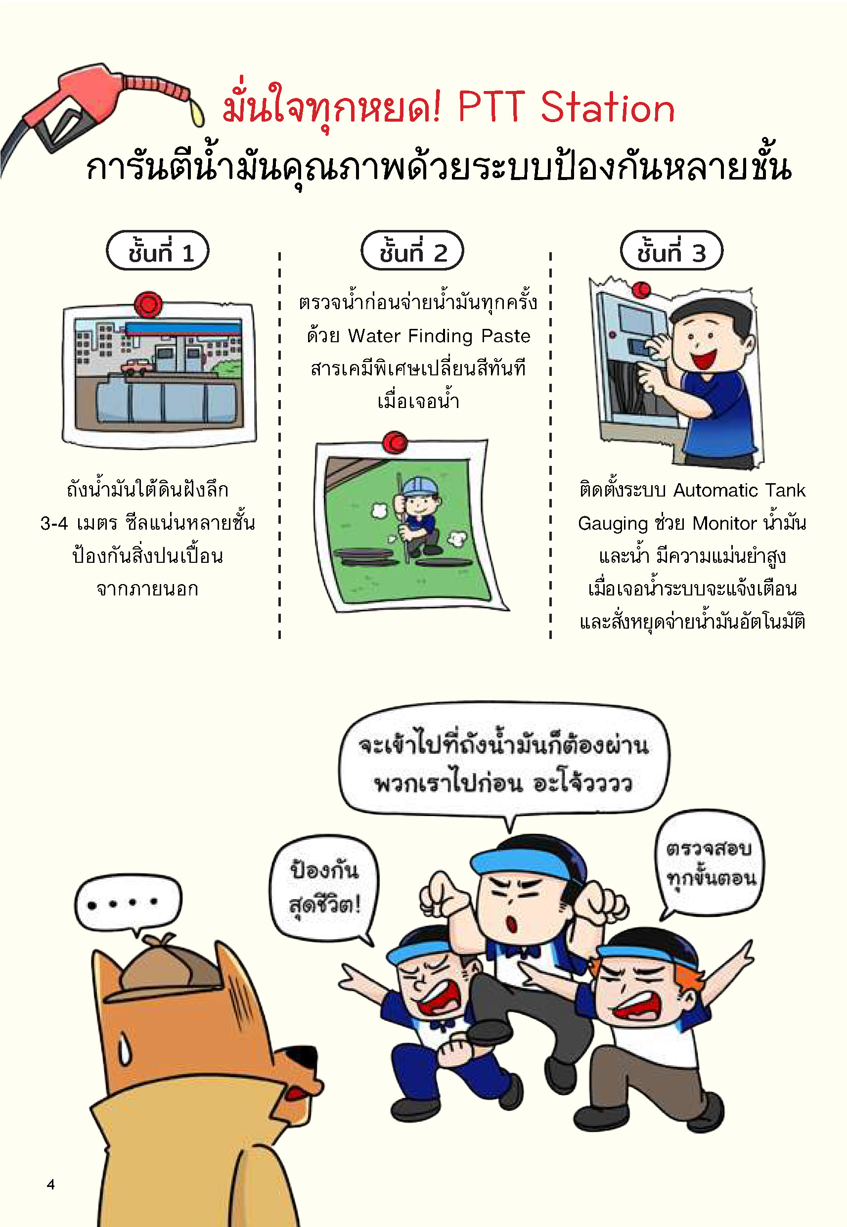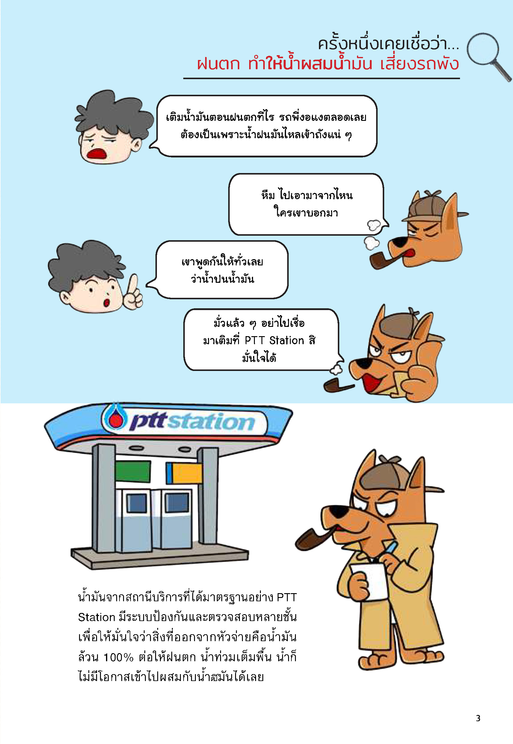 หลายคนยังจำความรู้สึกได้ดี ครั้งหนึ่งเติมน้ำมันตอนฝนตกแล้วรถดันอืดหรือสตาร์ตยาก ความบังเอิญเพียงครั้งเดียวกลายเป็นคำบอกเล่าที่ทำให้คนเชื่อว่าฝนสามารถไหลเข้าถังน้ำมันของสถานีบริการได้ แต่เมื่อเปิดแฟ้ม บลู Files ของหมาบลู ที่เผยถึงโครงสร้างระบบป้องกันหลายชั้นที่สถานีบริการ PTT Station ใช้กันจริง เช่น ถังน้ำมันที่ฝังใต้ดินลึก 3-4 เมตร ซีลหลายชั้น และยังตรวจน้ำด้วยสารพิเศษ Water Finding Paste ซึ่งเปลี่ยนสีทันทีเมื่อสัมผัสน้ำ ก่อนจะจ่ายให้ลูกค้า ระบบ ATG (Automatic Tank Gauging) ยังทำงานเหมือนยามเฝ้าประตู คอยแจ้งเตือนทันทีหากพบความผิดปกติใดๆ และจะหยุดการจ่ายอัตโนมัติทันทีเพื่อความปลอดภัย
