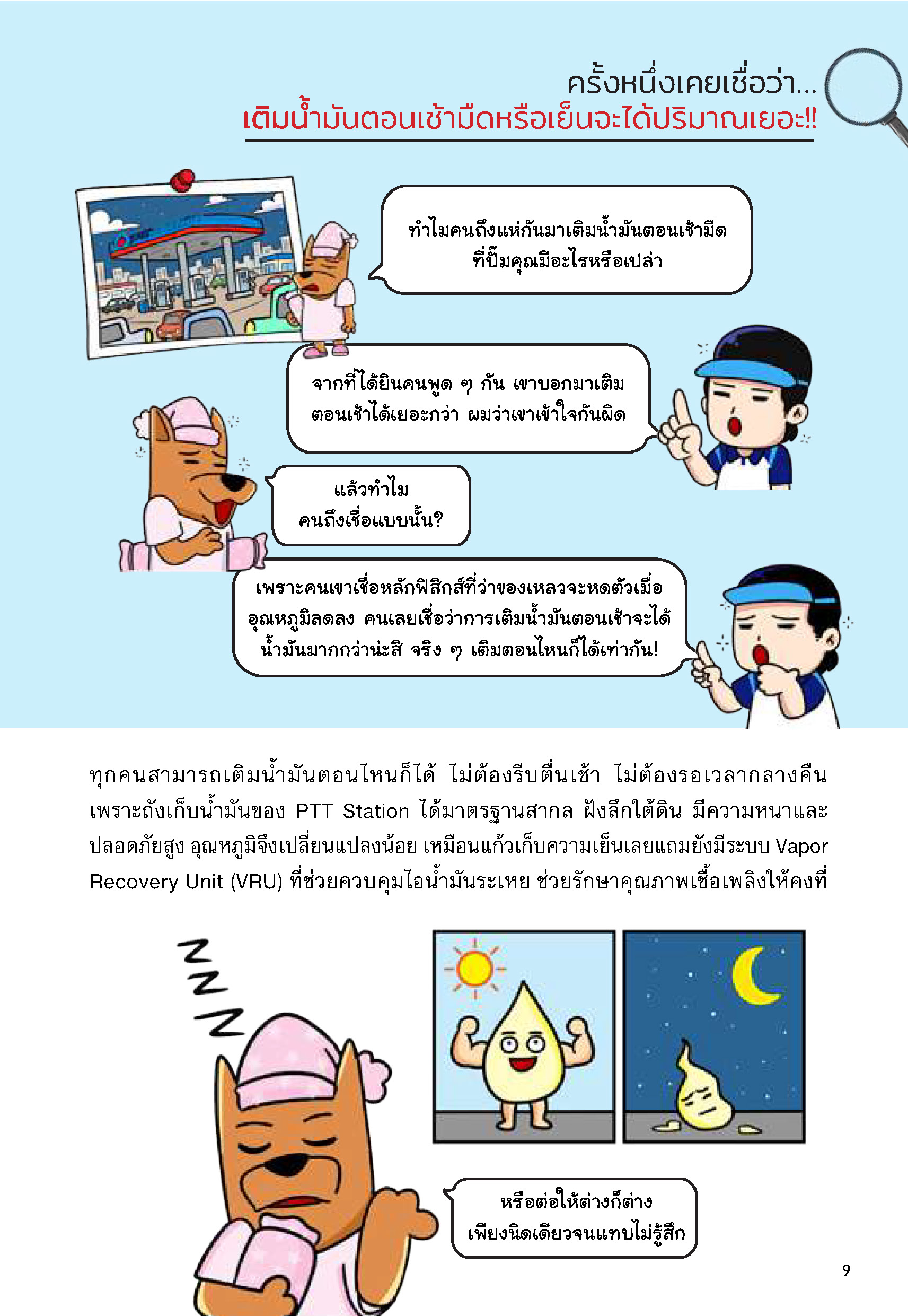 รวมไปถึงความเชื่อที่ว่า การเติมน้ำมันตอนเช้ามืด จะได้ปริมาณน้ำมันมากกว่า เพราะเรียนรู้มาว่า ของเหลวจะหดตัวเมื่ออุณหภูมิลดลง จึงคิดว่าการเติมน้ำมันตอนเช้าจะได้ปริมาณมากกว่า แม้ความเชื่อนี้ดูมีเหตุผล แต่ในความจริงของสถานีบริการ ถังน้ำมันถูกฝังใต้ดินและทำตัวเหมือนแก้วเก็บความเย็น ซึ่งอุณหภูมิไม่เปลี่ยนแปลงตามสภาพอากาศง่ายๆ บลู Files อธิบายอย่างชัดเจนว่า ไม่ว่าจะเติมน้ำมันตอนตี 5 หรือตอนบ่ายสาม ปริมาณที่ได้รับแทบไม่ต่างกันเลย เพราะถังใต้ดินรักษาอุณหภูมิให้คงที่ตลอดเวลา แถมยังมีระบบ Vapor Recovery Unit ที่ช่วยควบคุมไอระเหยและรักษาคุณภาพเชื้อเพลิงให้คงที่