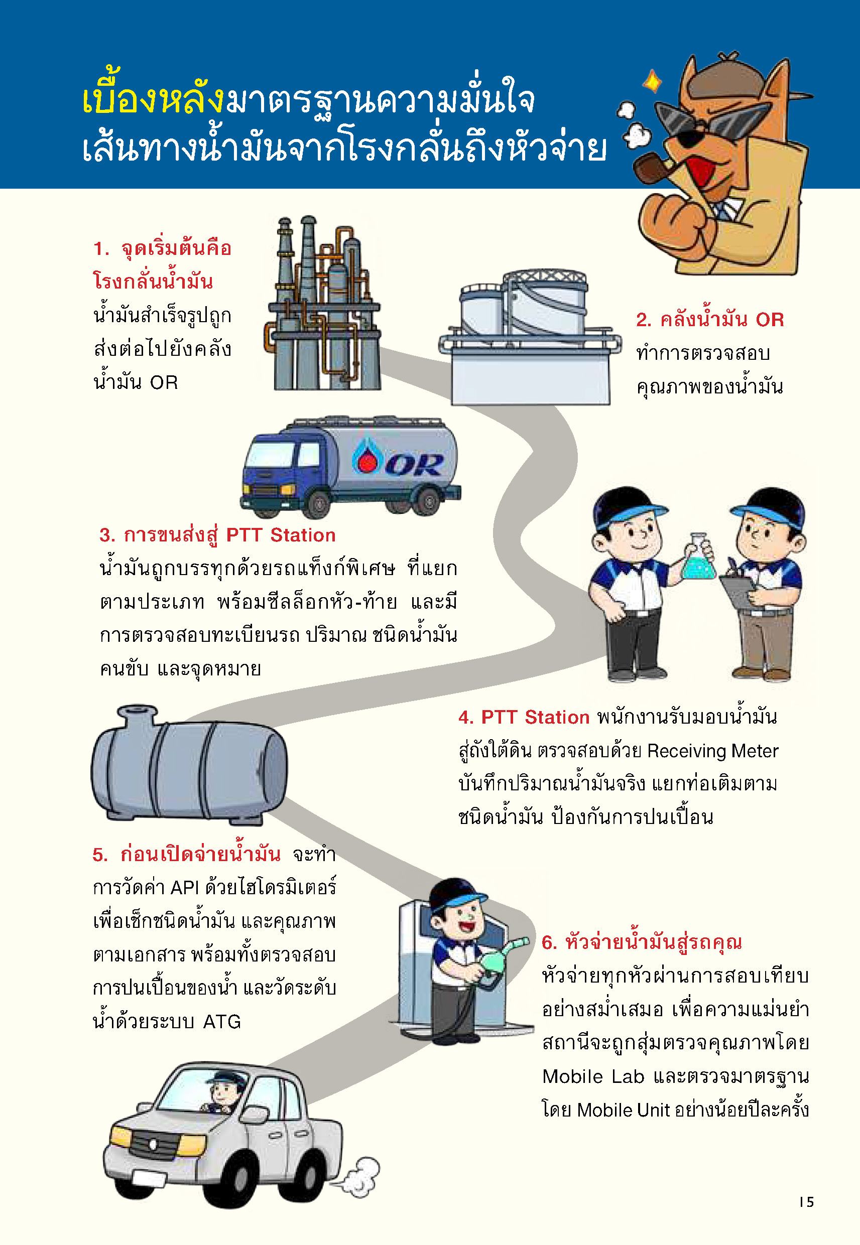 ไม่เพียงแค่แก้ไขความเข้าใจผิดในการเติมน้ำมันเท่านั้น หมาบลูยังพาไปดูเบื้องหลังของเส้นทางการผลิตน้ำมันของ OR ตั้งแต่โรงกลั่น คลังน้ำมัน รถแท็งก์ขนส่ง สถานีบริการ ก่อนจะมาสู่หัวจ่ายเติมน้ำมันเข้ารถ ทำให้เข้าใจว่าทุกขั้นตอนถูกออกแบบให้ตรวจสอบซ้ำแล้วซ้ำอีก
