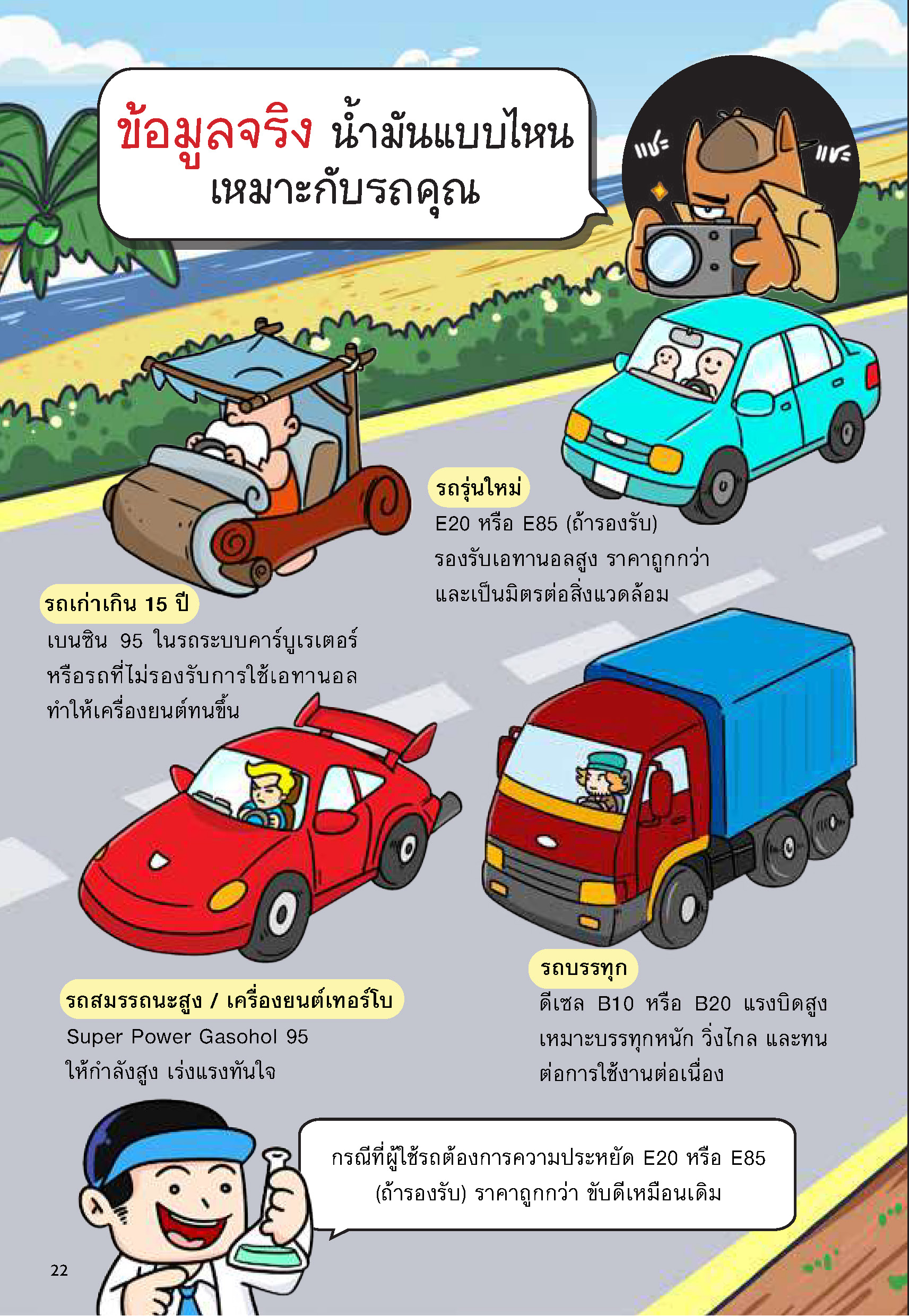 ‘บลู Files: แฟ้มลับ หมาเฝ้าปั๊ม’ ยังไม่ได้หยุดอยู่ที่การไขความเข้าใจผิด แต่ยังให้ข้อมูลเกี่ยวกับประเภทของน้ำมันชนิดต่างๆ ไม่ว่าจะเป็นเบนซิล แก๊สโซฮอล์ หรือดีเซล ที่มีค่าออกเทนและปริมาณเอทานอลแตกต่างกัน เหมาะกับรถยนต์ประเภทไหนบ้าง