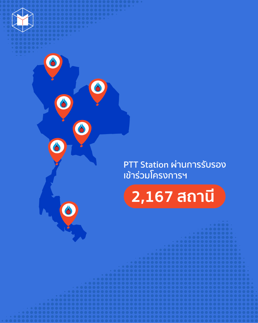 ปัจจุบัน PTT Station ทุกแห่งทั่วประเทศจำนวน 2,184 สถานี ได้สมัครเข้าร่วมโครงการครบถ้วนทั้งหมด 100% แล้ว โดยมีปั๊มที่ได้รับการอนุมัติให้ผ่านการรับรอง หรือได้รับ ‘ป้ายสัญลักษณ์สีน้ำเงิน’ แล้ว 2,167 สถานี ส่วนที่เหลืออยู่ระหว่างดำเนินการและรออนุมัติ