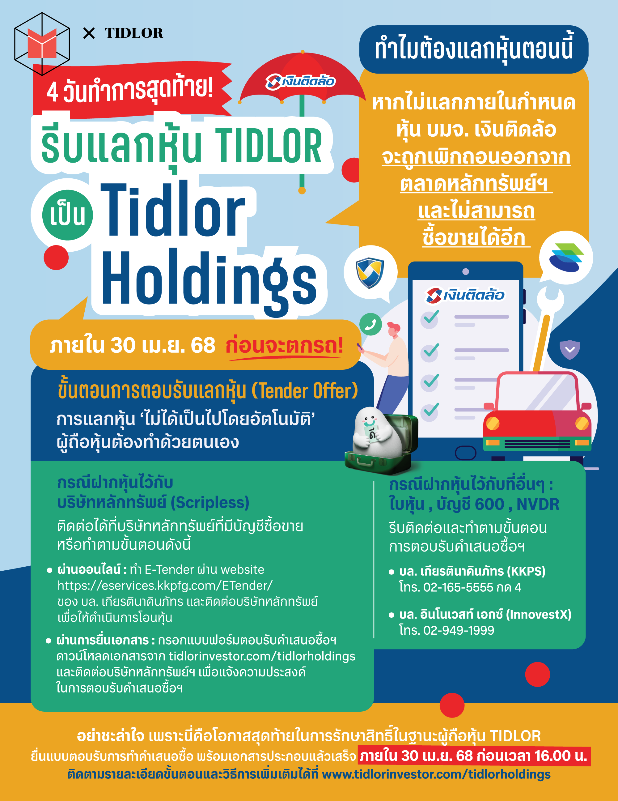 ใกล้เข้ามาทุกทีแล้ว! เหลือเพียง 4 วันทำการสุดท้าย ที่ผู้ถือหุ้นบมจ. เงินติดล้อ หรือ TIDLOR สามารถตอบรับคำเสนอซื้อหลักทรัพย์โดยแลกหุ้นเป็น Tidlor Holdings เพื่อรักษาสิทธิประโยชน์สูงสุด