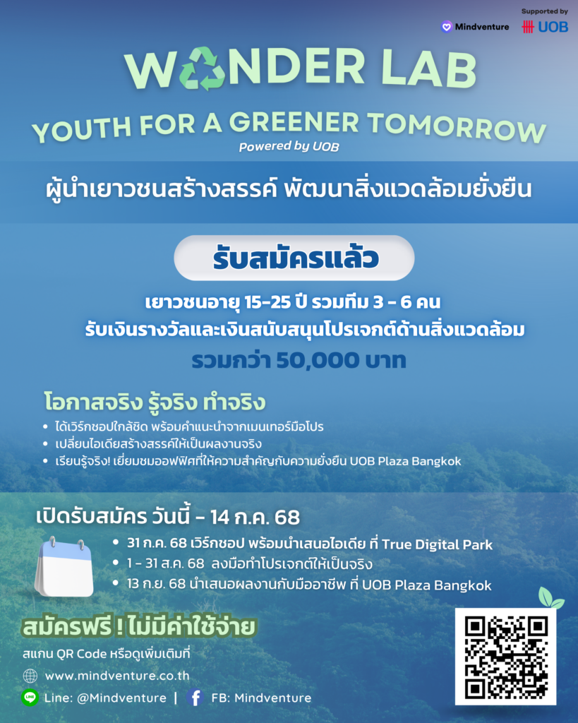 เชิญชวนเยาวชน อายุ 15 – 25 ปี (ทีมละ 3-6 คน) ร่วมเป็นพลังแห่งการเปลี่ยนแปลง เพื่อโลกที่ยั่งยืนใน Wonder Lab: Youth for a Greener Tomorrow Powered by UOB