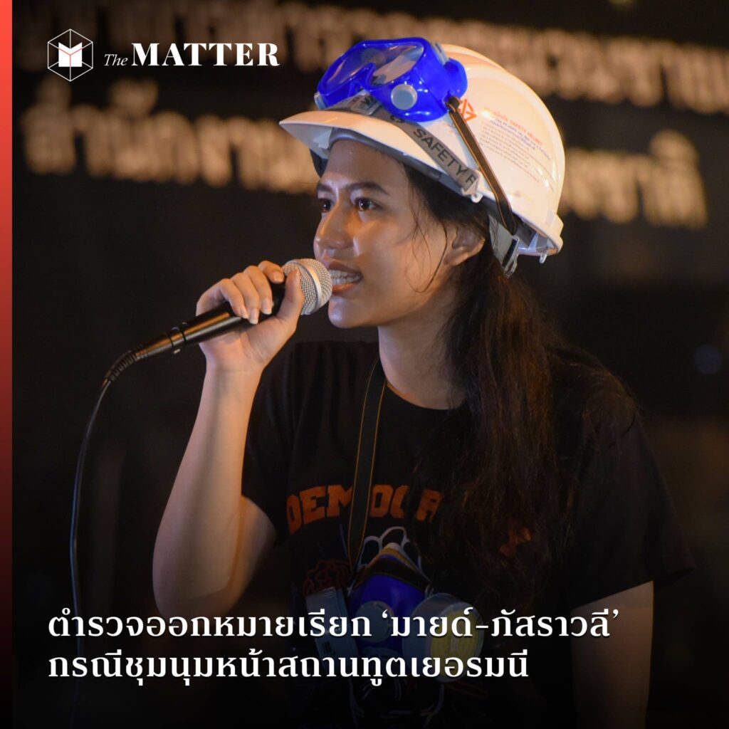ภัสราวลี ธนกิจวิบูลย์ผล หรือมายด์ โพสต์ภาพหมายเรียกจาก สน.ทุ่งมหาเมฆ ในเฟซบุ๊กส่วนตัว พร้อมระบุข้อความว่า “หมายเรียกจากการชุมนุมหน้าสถานทูตมาถึงแล้วค่ะ”