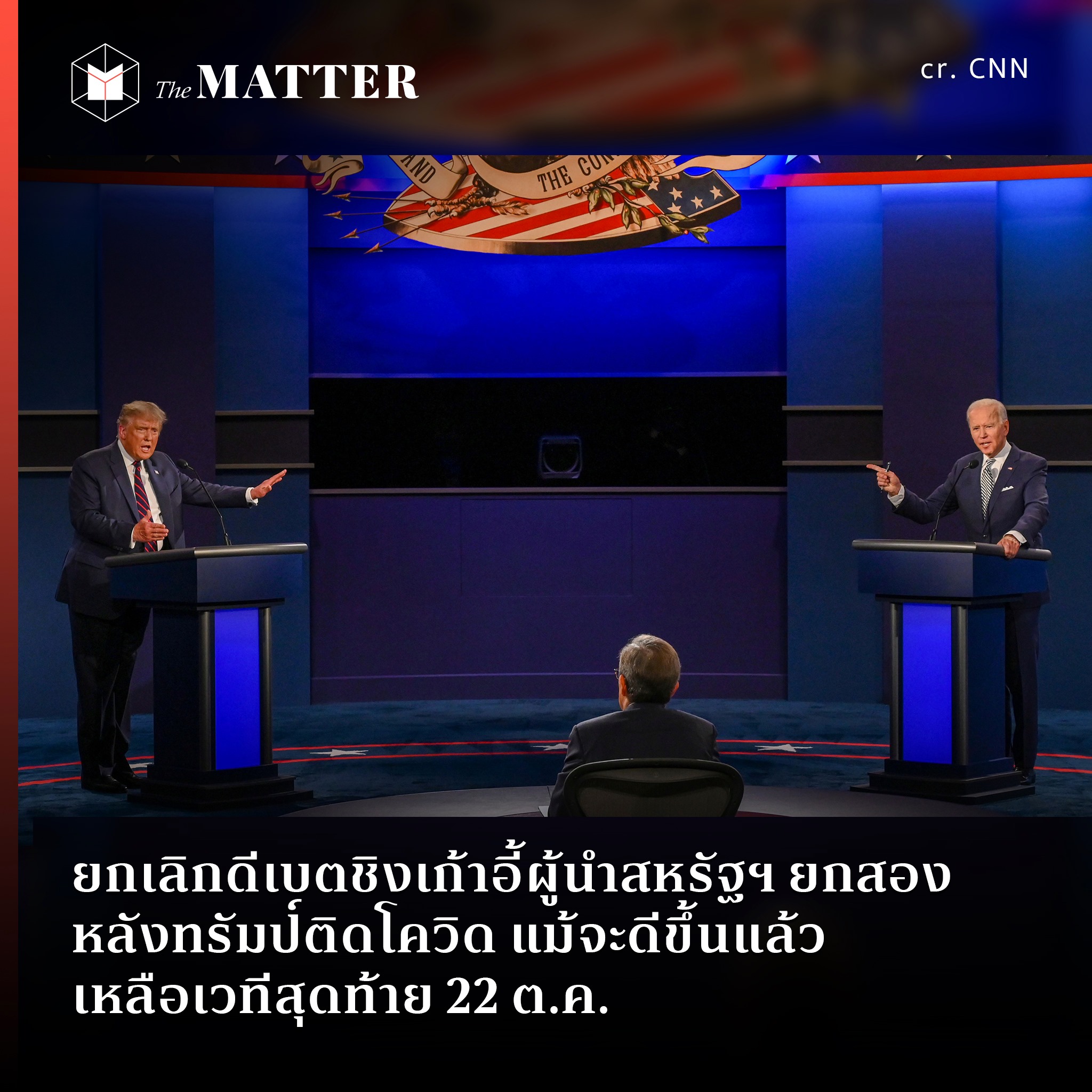 ล่าสุด เวทีที่สอง ที่เดิมจะมีขึ้นในวันที่ 15 ตุลาคม ที่เมืองไมอามี รัฐฟลอริดา ก็ถูกยกเลิกไป หลังคณะกรรมการผู้จัดงานเสนอให้เปลี่ยนไปจัด debate แบบ ‘เสมือน’ (virtual) แทน โดยให้ทรัมป์และไบเดนอยู่คนละที่กัน แต่ไอเดียนี้ถูกทรัมป์ปฏิเสธ และข้อเสนอให้เลื่อน debate ออกไป ก็ถูกไบเดนปฏิเสธ