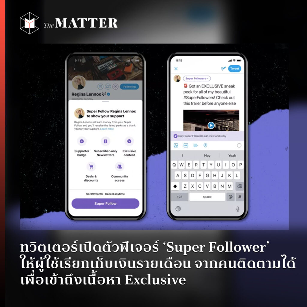 อยากเห็นเนื้อหาพิเศษ ต้องจ่ายค่าสมาชิก! ในอนาคต ผู้ใช้บริการ Twitter จะมีช่องทางสร้างรายได้ได้มากขึ้น เพราะล่าสุดนี้ แพลตฟอร์มได้เปิดตัวฟีเจอร์ใหม่ที่ชื่อ ‘Super Follower’ ที่จะเปิดให้ผู้ใช้งานสามารถเรียกเก็บเงินจากผู้ติดตามได้ หากต้องการเข้าถึงเนื้อหาพิเศษ