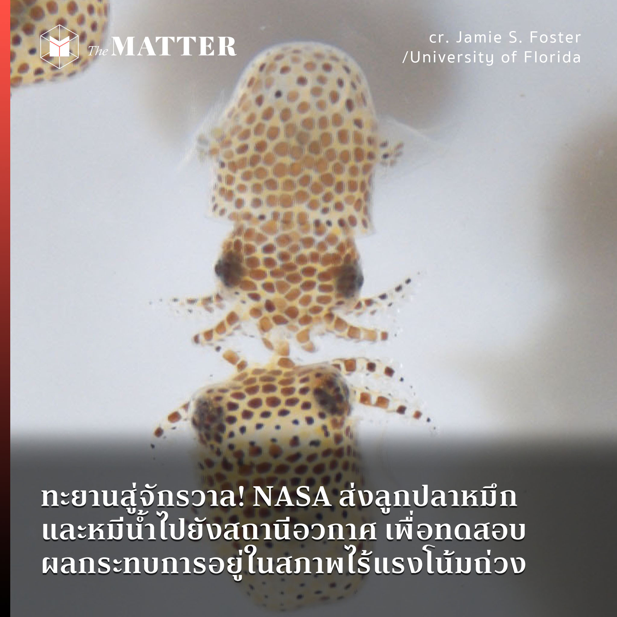 โบกมือลาโลก ย้ายถิ่นฐานไปยังอวกาศชั่วคราว องค์การบริหารการบินและอวกาศแห่งชาติ (NASA) ส่งลูกปลาหมึกมากกว่า 100 ตัว และหมีน้ำ สัตว์ขนาดเล็กจิ๋วที่มองไม่เห็นด้วยตาเปล่าอีกราวๆ 5,000 ตัว ขึ้นไปปฏิบัติหน้าที่พิเศษยังสถานีอวกาศนานาชาติ (ISS) เมื่อวันที่ 3 มิถุนายนที่ผ่านมา