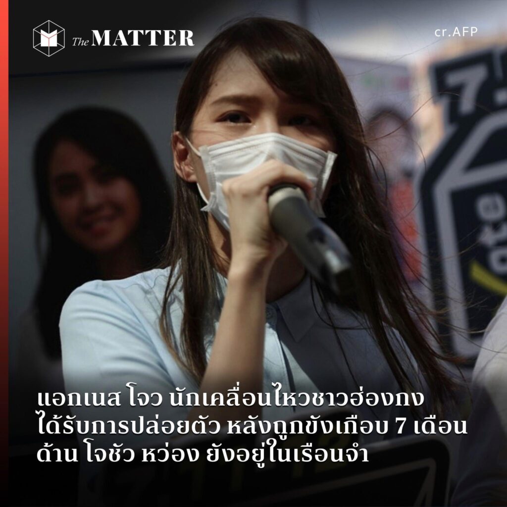 หลังจากถูกทางการฮ่องกงควบคุมตัวอยู่เกือบ 7 เดือน แอกเนส โจว สุภาพสตรีนักเคลื่อนไหวเพื่อประชาธิปไตยชาวฮ่องกงก็ได้รับการปล่อยตัวเมื่อเช้าวันที่ 12 มิถุนายน หรือวันนี้แล้ว
