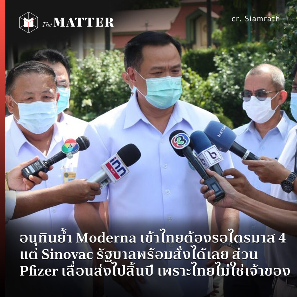 โดย อนุทิน ชาญวีรกูล รองนายกรัฐมนตรี และรัฐมนตรีว่าการกระทรวงสาธารณสุข ได้ตอบคำถามนักข่าว ถึงความกังวลว่า การนำเข้าวัคซีนทางเลือกของ Moderna มีความล่าช้า ทั้งๆ ที่ทางสำนักงานคณะกรรมการอาหารและยา (อย.) ได้ขึ้นทะเบียนรับรองคุณภาพแล้ว ยืนยันว่าไม่ล่าช้า เพราะมีการตกลงกันแต่แรกแล้ว ว่าจะมีการจัดส่งวัคซีนของ Moderna มาในไตรมาสที่ 4