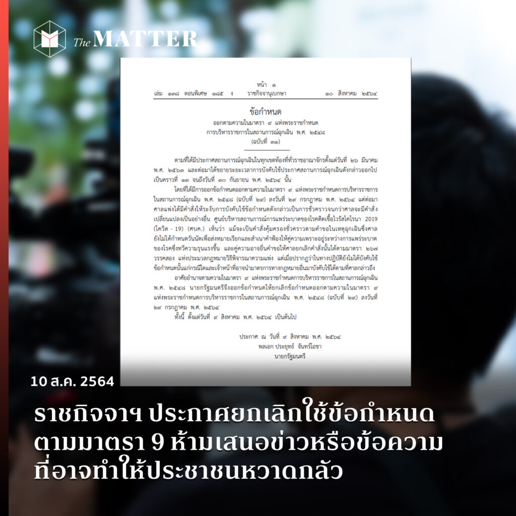 นายกฯ ประยุทธ์ จันทร์โอชา ลงนามในราชกิจจาฯ ยกเลิกข้อกำหนดตามความในมาตรา 9 แห่งพระราชกำหนดการบริหารราชการฉุกเฉิน พ.ศ.2548 “ห้ามเผยแพร่ข้อความหรือเนื้อหาที่สร้างความหวาดกลัวให้ประชาชน” โดยมีผลตั้งแต่วันที่ 10 สิงหาคม 2564 เป็นต้นไป