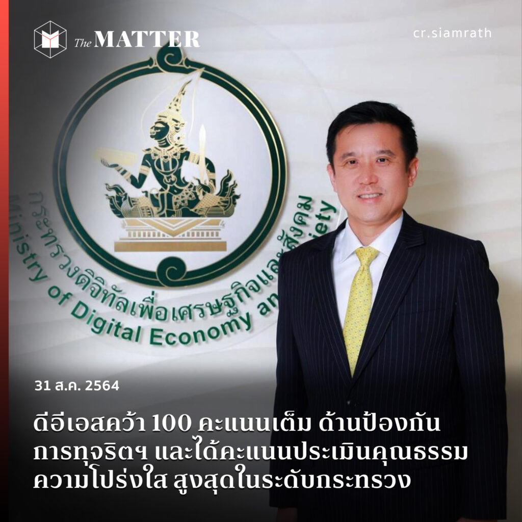 โปร่งใส ซื่อตรง ตรวจสอบได้? กระทรวงดิจิทัลเพื่อเศรษฐกิจและสังคม (DES) ได้คะแนน 100 เต็มในด้านการป้องกันการทุจริต และได้คะแนนประเมินคุณธรรมและความโปร่งใส 95.42 คะแนน ซึ่งเป็นหน่วยงานที่ได้คะแนนสูงสุดเป็นอันดับ 1 จากบรรดาทุกกระทรวง