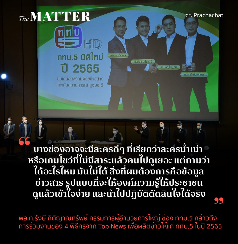 “บางช่องอาจจะมีละครดีๆ ที่เรียกว่าละครน้ำเน่า หรือเกมโชว์ที่ไม่มีสาระแล้วคนไปดูเยอะ แต่ถามว่าได้อะไรไหม มันไม่ได้ สิ่งที่ผมต้องการคือข้อมูลข่าวสาร รูปแบบที่จะให้องค์ความรู้ให้ประชาชนดูแล้วเข้าใจง่าย และนำไปปฏิบัติตัดสินใจได้จริง”