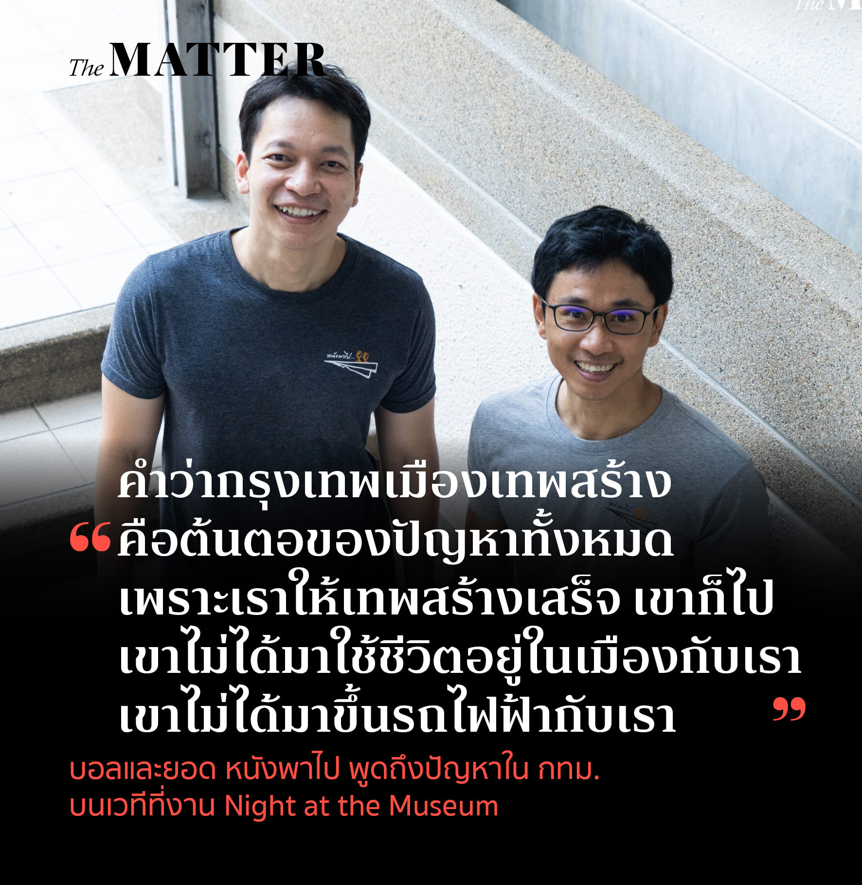 “ใครเคยเห็นเทพมาเบียดอยู่บนรถเมล์ ขสมก. ในวันฝนตกกับเราบ้างไหม” คือคำเปรียบเปรยจาก บอล–ทายาท เดชเสถียร และ ยอด–พิศาล แสงจันทร์ เมื่อพูดถึงปัญหาการพัฒนากรุงเทพฯ บนเวที ที่งาน Night at the Museum