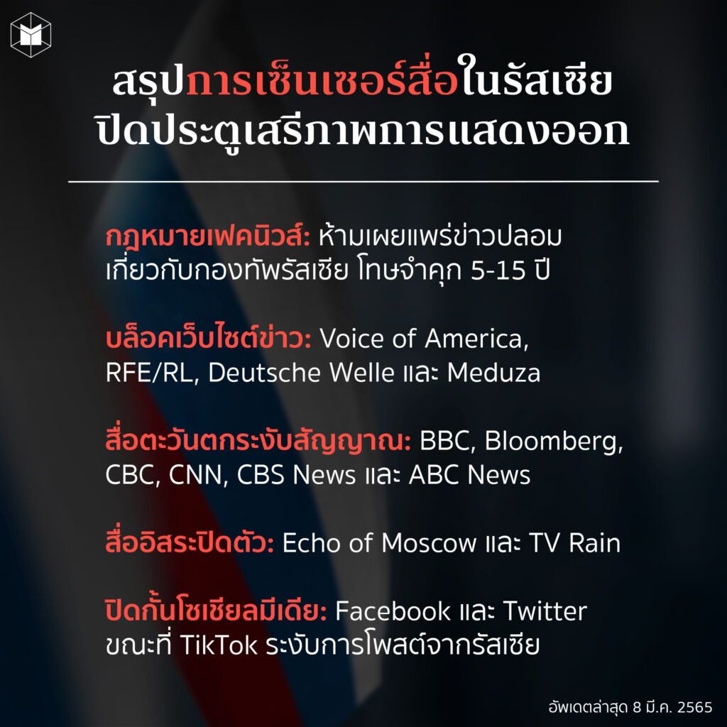 ขณะที่สื่ออิสระในรัสเซียอย่าง TV Rain หรือ Echo of Moscow สถานีวิทยุที่ก่อตั้งโดยฝ่ายต่อต้านโซเวียตในปี 1990 ก็ได้รับแรงกดดันจากรัฐบาลจนต้องปิดตัวไปก่อนหน้านี้แล้ว