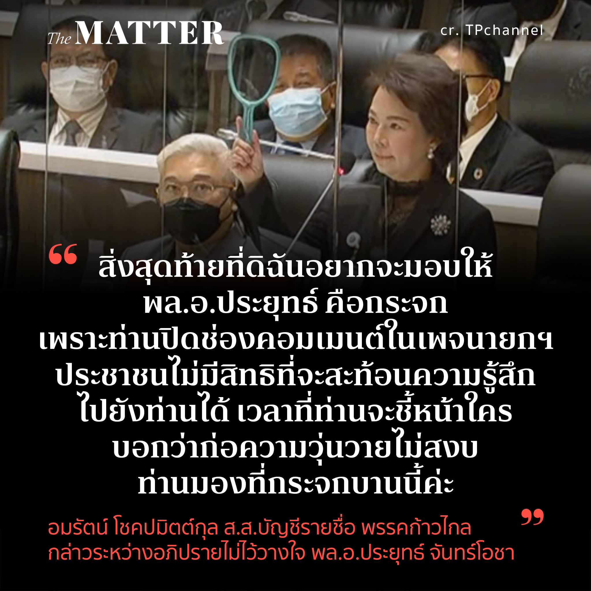 ก่อนที่อมรัตน์จะยกกระจกขึ้นมา พร้อมกล่าวว่า “ดิฉันมีสิ่งสุดท้ายที่ดิฉันอยากจะมอบให้ พล.อ.ประยุทธ์ ผ่านท่านประธาน สิ่งนั้นคือกระจก กระจกบานนี้ ดิฉันจะมอบให้ พล.อ.ประยุทธ์ จันทร์โอชา เพราะท่านปิดช่องคอมเมนต์ในเพจนายกฯ ในเพจชื่อประยุทธ์ จันทร์โอชา ประชาชนไม่มีสิทธิที่จะสะท้อนความรู้สึกไปยังท่านได้