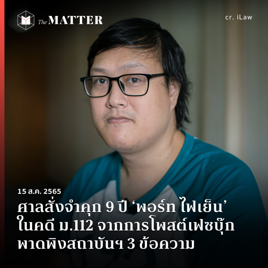 ศาลอาญามีคำพิพากษาวันนี้ (15 ส.ค. 2565) สั่งจำคุก ‘พอร์ท’ ปริญญา ชีวินกุลปฐม นักดนตรีวง ‘ไฟเย็น’ เป็นเวลา 9 ปี ในคดี ม.112 และ พ.ร.บ.คอมพิวเตอร์ฯ ม.14(3) จากการถูกกล่าวหาว่าโพสต์เฟซบุ๊กพาดพิงสถาบันกษัตริย์ จำนวน 3 ข้อความ