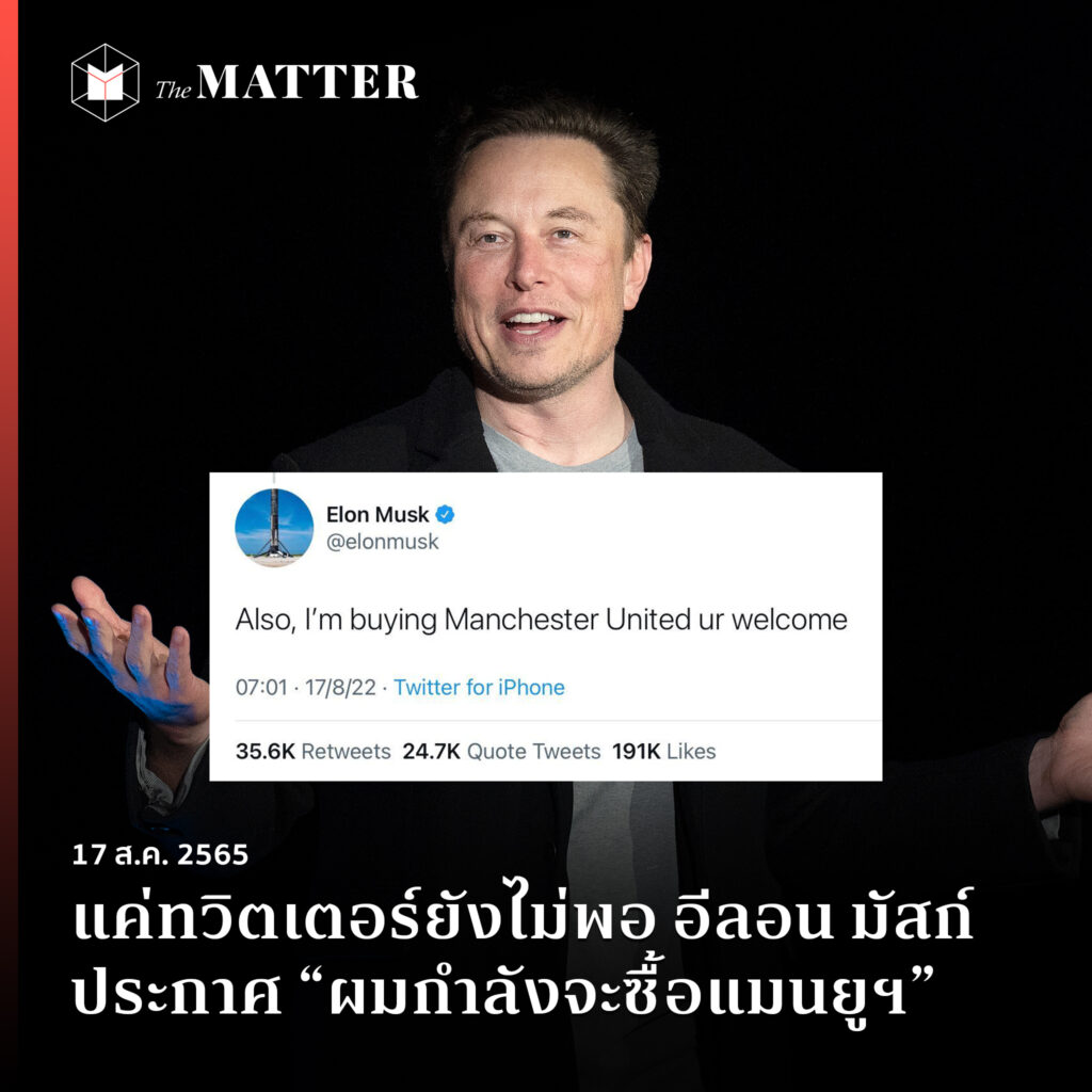 มัสก์เพิ่งทวีตข้อความเมื่อเวลา 7.01 น. ของวันนี้ (17 ส.ค. 2565) ตามเวลาไทย บอกว่า “เออ ผมกำลังจะซื้อแมนเชสเตอร์ยูไนเต็ดนะ ด้วยความยินดี” (“Also, I’m buying Manchester United ur welcome.”)