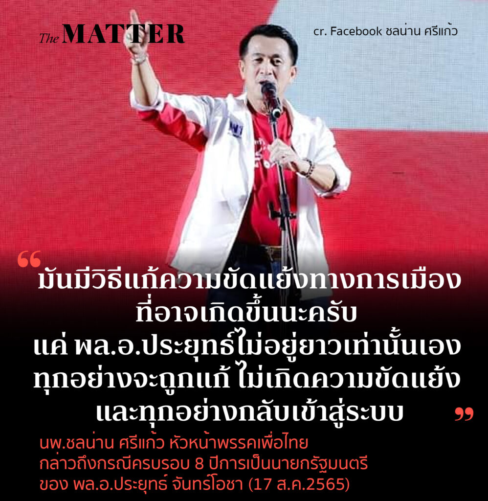 วันนี้ (17 ส.ค. 65) ชลน่าน ศรีแก้ว ส.ส.น่าน และหัวหน้าพรรคเพื่อไทย ให้สัมภาษณ์กับ The MATTER ถึงกรณีที่ พล.อ.ประยุทธ์ จันทร์โอชา ดำรงตำแหน่งในฐานะนายกรัฐมนตรีเกือบครบ 8 ปี ซึ่งกำลังเป็นประเด็นที่หลายฝ่ายตั้งข้อสังเกตว่าอาจขัดต่อรัฐธรรมนูญ