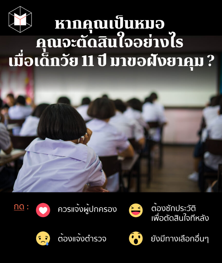 โดยอธิบายว่า ไม่ถือว่าเป็นความผิดของแพทย์ เพราะกฎหมายให้อำนาจเด็กตัดสินใจได้ และหากนำข้อมูลไปแจ้งผู้ปกครอง ยังถือเป็นความผิดกรณีเปิดเผยข้อมูลการรักษา