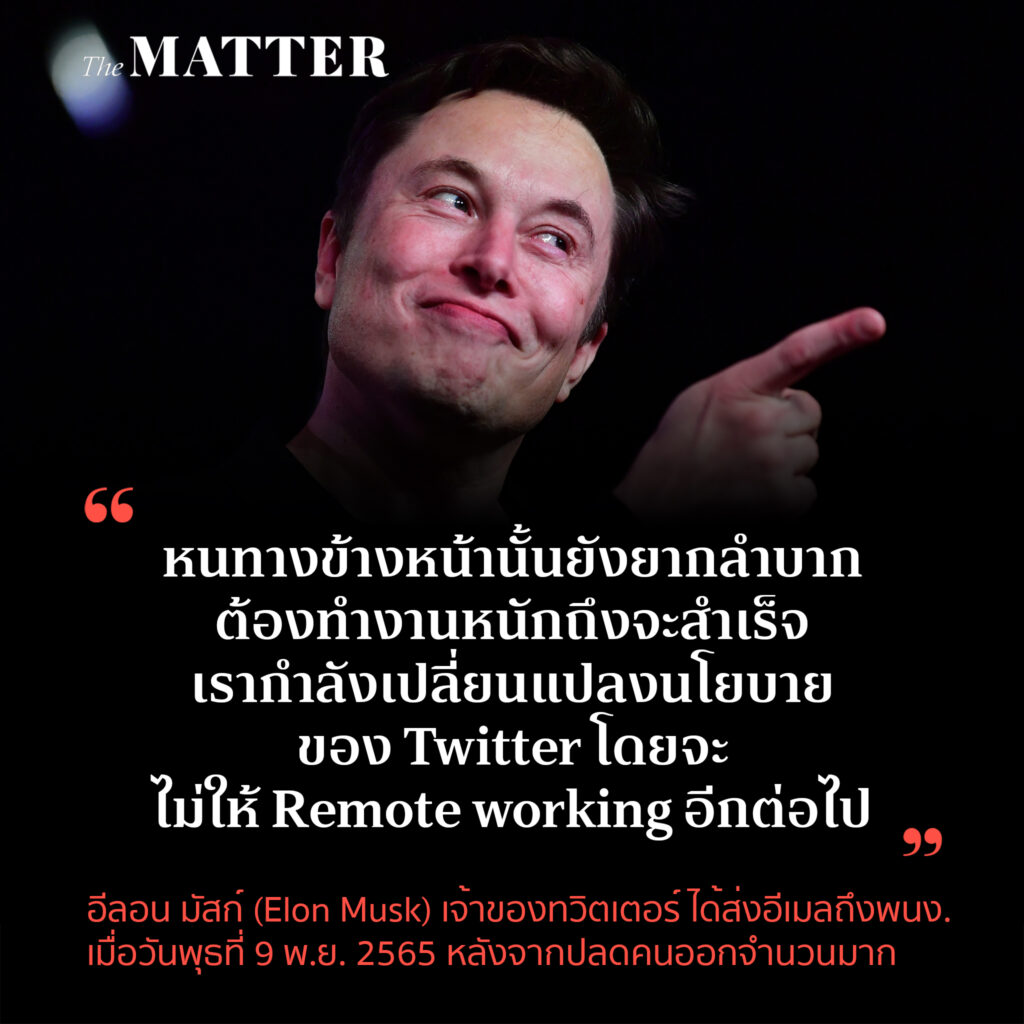 ถ้าตอนนี้คุณเป็นพนักงานทวิตเตอร์ คงต้องตัดสินใจแล้วว่า จะปิดเสียงแจ้งเตือนข้อความกลางดึกหรือไม่ เพราะเมื่อวันพุธที่ผ่านมา (9 พฤศจิกายน) พวกเขาต่างต้องลุกมาตกใจอีกครั้ง กับอีเมลฉบับแรกจากเจ้านายใหญ่คนใหม่ เพื่อบอกกว่าจะไม่อนุญาตให้ Remote working หรือทำงานทางไกลอีก แล้วอย่างนี้ใครจะหลับต่อไหว