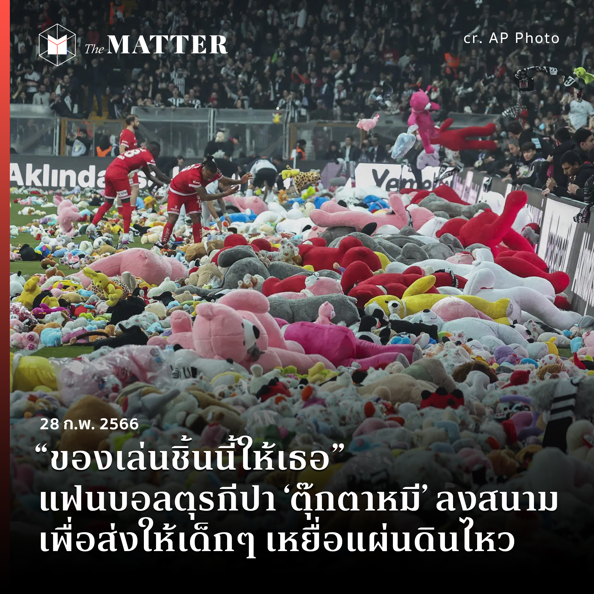 “แฟนๆ ของเราโยนผ้าพันคอ หมวก และตุ๊กตา ลงบนพื้นที่สนามโวดาโฟนปาร์ก เป็นการมอบของขวัญให้กับเด็กๆ ในพื้นที่แผ่นดินไหว เพื่อสร้างขวัญและกำลังใจ” สโมสรเบซิกตัส กล่าวในแถลงการณ์