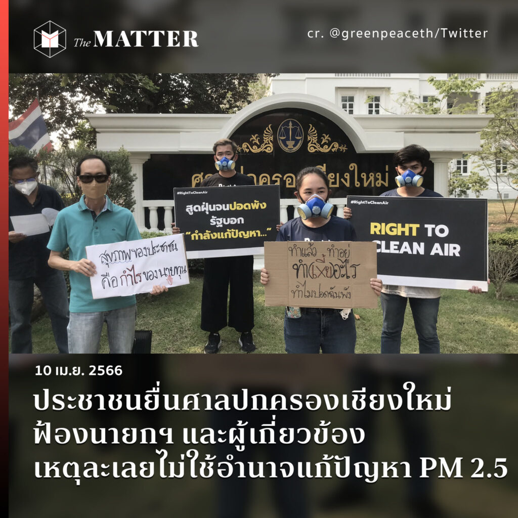 การจัดการปัญหาฝุ่น PM 2.5 ประชาชนคงจะเริ่มแก้ไขด้วยตัวเองทั้งหมดไม่ได้ ทำให้วันนี้ (10 เมษายน) กลุ่มประชาชนภาคเหนือพร้อมเครือข่ายรวมตัวที่ศาลปกครองเชียงใหม่ เพื่อยื่นฟ้อง พล.อ.ประยุทธ์ จันทร์โอชา นายกรัฐมนตรี พร้อมผู้มีส่วนเกี่ยวข้อง ได้แก่ รัฐมนตรี คณะกรรมการสิ่งแวดล้อมแห่งชาติ และคณะกรรมการกำกับหลักทรัพย์และตลาดหลักทรัพย์ (กลต.) ให้ดำเนินการตามกฎหมายและนโยบายที่เกี่ยวข้องกับการจัดการและลดทอนความรุนแรงของฝุ่นพิษ