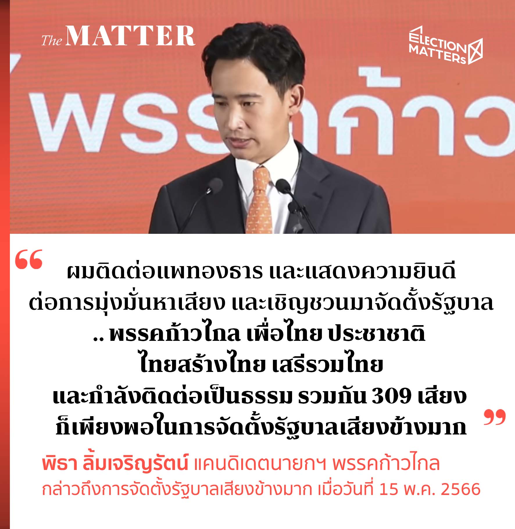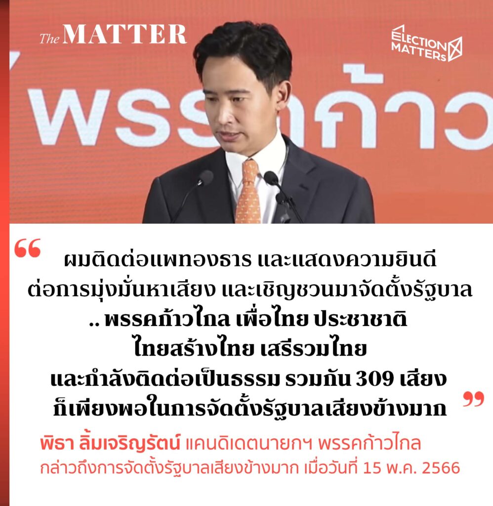 วันนี้ (15 พฤษภาคม) พิธา แถลงความคืบหน้าในการจัดตั้งรัฐบาล หลังผลการเลือกตั้งรายงานมาเกิน 95% แล้ว โดยประกาศว่า พร้อมเป็นนายกรัฐมนตรีคนต่อไปของประเทศไทย