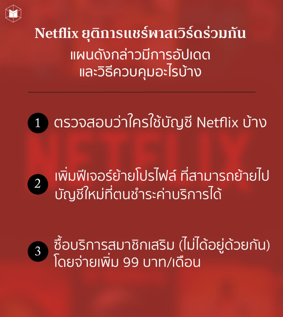 หลังจากมีข่าวลือมาอย่างต่อเนื่องว่า Netflix จะยุติการแชร์พาสเวิร์ดเพื่อใช้งานร่วมกับคนอื่น (ที่ไม่ใช่บุคคลในครอบครัว) ล่าสุดแผนดังกล่าวเริ่มต้นใช้งานในประเทศไทยแล้ว ทำให้หากต้องการที่จะแชร์พาสเวิร์ดร่วมกัน จะต้องซื้อบริการสมาชิกเสริมในราคา 99 บาทต่อเดือน