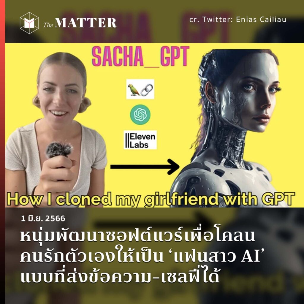 สิ่งที่คุณอ่านข้างต้น ไม่ใช่แชทสนทนาระหว่างคนด้วยกัน แต่เป็นข้อความที่ อีเนียล เคลเลียล (Enias Cailiau) นักพัฒนา (developer) คุยกับ ‘ซาช่า’ (Sacha) แฟนสาว AI ที่สามารถพิมพ์ข้อความหา ส่งข้อความเสียง และส่งรูปเซลฟี่มาด้วย