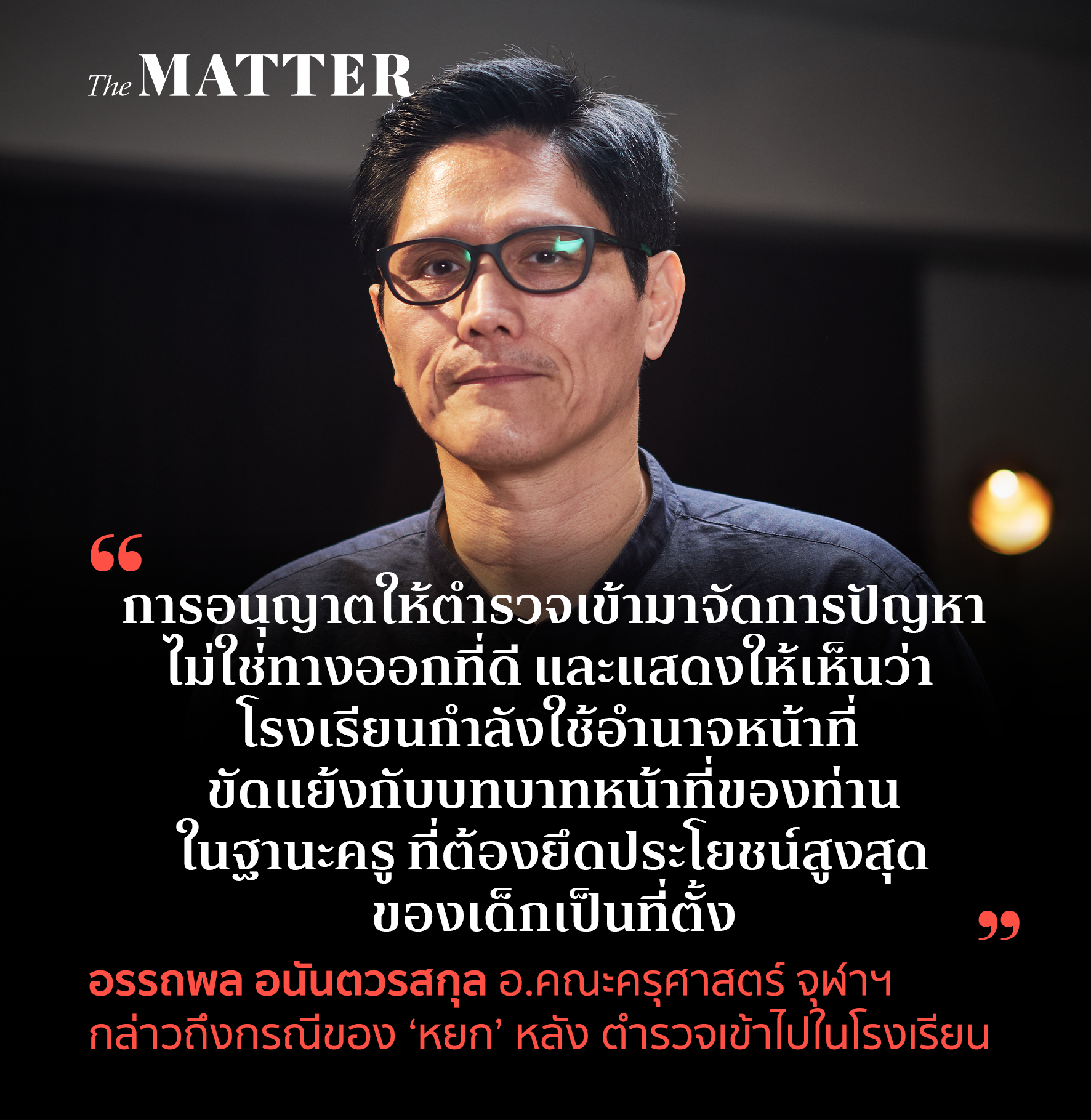 คำกล่าวจาก อรรถพล อนันตวรสกุล อาจารย์ประจำคณะครุศาสตร์ จุฬาลงกรณ์มหาวิทยาลัย ถึงกรณีของหยก—ธนลภย์ เยาวชนวัย 15 ปี ที่อารยะขัดขืนด้วยการแต่งชุดไปรเวทเข้าไปในโรงเรียนเตรียมอุดมศึกษาพัฒนาการติดต่อกันหลายวัน และในวันนี้ ก็มีตำรวจหญิงราว 9-10คน ตามเข้าไปในโรงเรียนด้วย