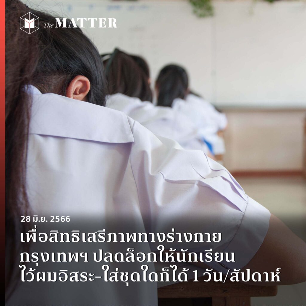 เพราะล่าสุด กทม. เพิ่งออกบันทึกข้อความที่ปลดล็อกให้นักเรียนใส่ชุดใดก็ได้โดยไม่บังคับอย่างน้อย 1 วัน/สัปดาห์ เพื่อลดภาระค่าใช้จ่ายของผู้ปกครอง และให้นักเรียนไว้ทรงผมอิสระบนพื้นฐานสุขอนามัยที่ดี เพื่อเคารพสิทธิและศักดิ์ศรีความเป็นมนุษย์ของนักเรียน