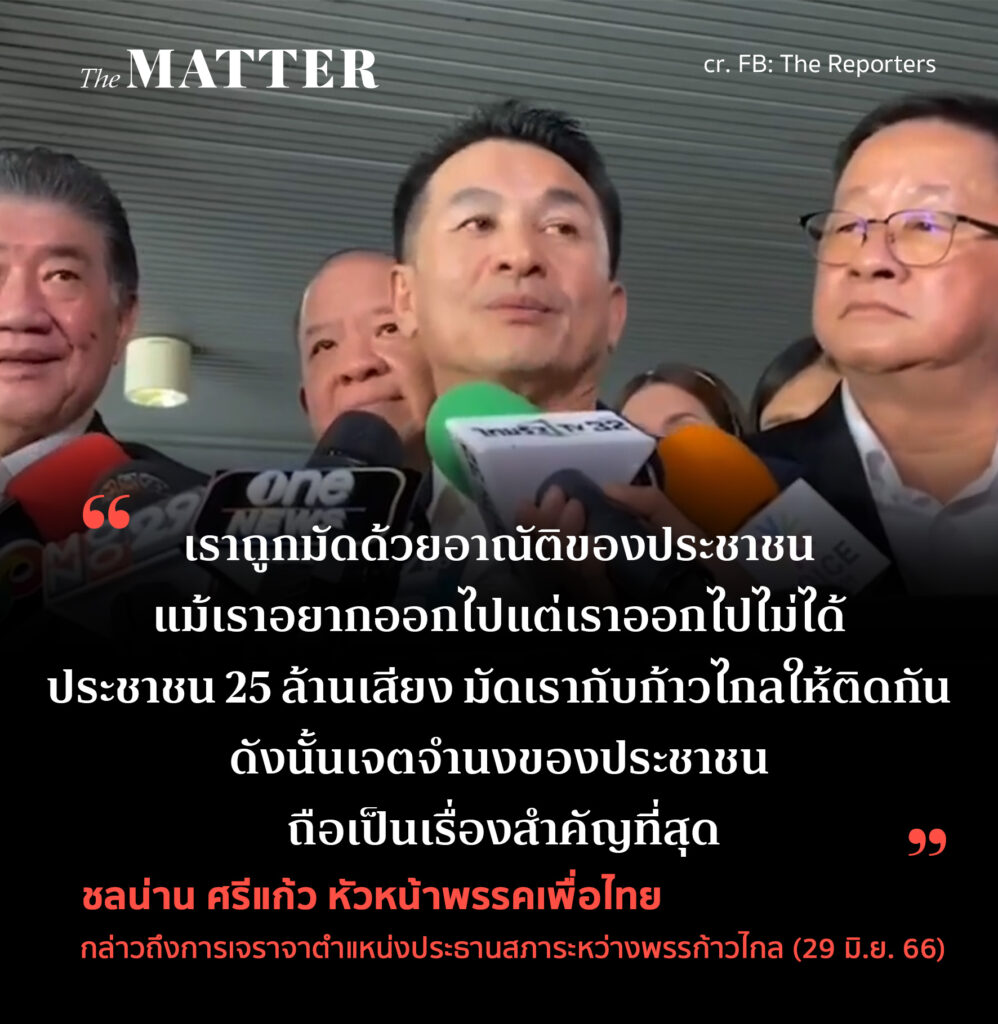 “เราถูกมัดด้วยอานัติของประชาชน แม้เราอยากออกไป แต่เราออกไปไม่ได้ เน้นนะครับ เราออกไปไม่ได้ แม้เป็นสิทธิของเราในการออกไปด้วย แต่ถูกพี่น้องประชาชน 25 ล้านเสียงมัดเรากับก้าวไกลให้ติดกัน เปรียบเสมือนพ่อแม่เราจับเราที่เป็นลูกจับคลุมถุงชนให้มาแต่งงานกัน เราไม่มีสิทธิปฏิเสธเพราะฉะนั้นเสียงของประชาชน 25 ล้านคนสำคัญที่สุด เราคำนึงถึงจุดนี้เป็นหลักในการเจรจาพูดคุย และการนำเสนอทุกเรื่อง เมื่อก้าวไกลเขาไม่ให้ เราก็ต้องมาพิจารณาว่า เขาไม่ให้ เราก็ไม่ควรจะต้องรับ”