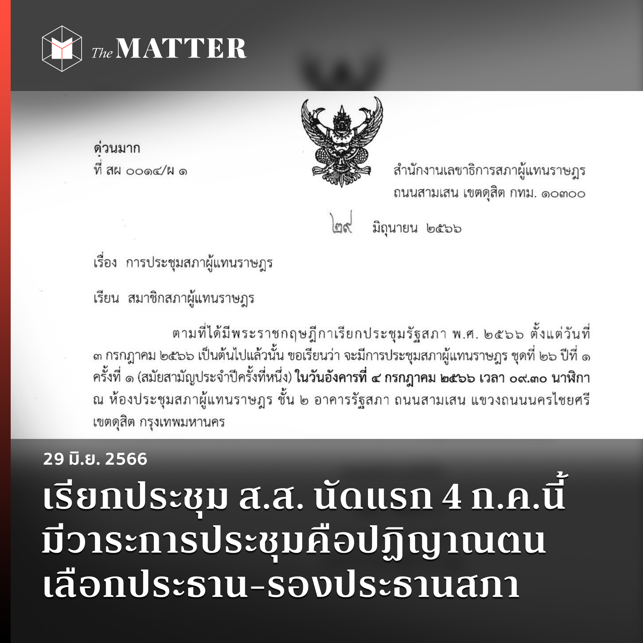 วันนี้ (29 มิถุนายน) เลขาธิการสภาผู้แทนราษฎร มีหนังสือแจ้งไปยัง ส.ส. เรื่องการประชุมสภาผู้แทนราษฎร ระบุว่า จะมีการประชุมสภาผู้แทนราษฎร ชุดที่ 26 ปีที่ 1 ครั้งที่ 1ในวันอังคารที่ 4 กรกฎาคม เวลา 09.30 น.ที่จะถึงนี้