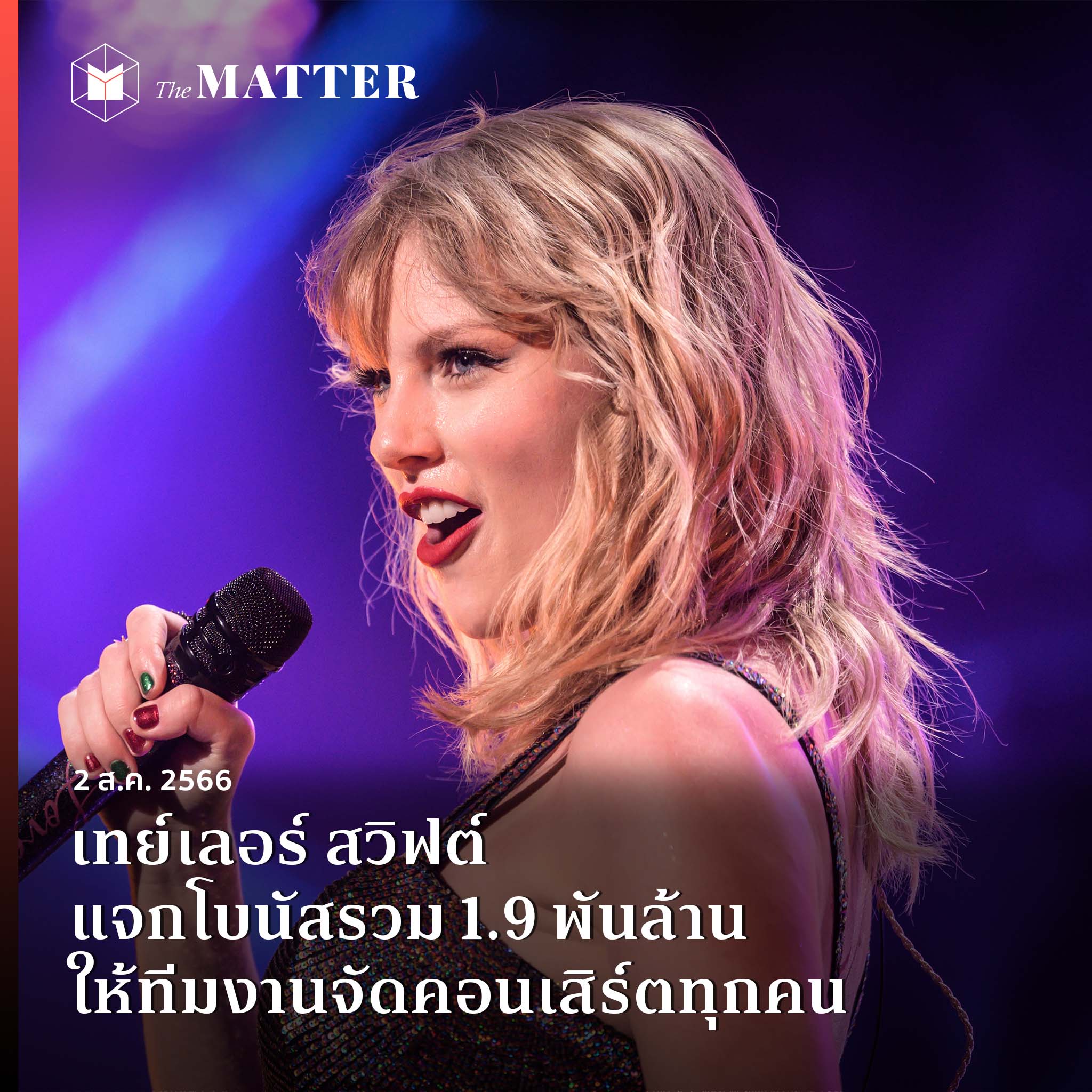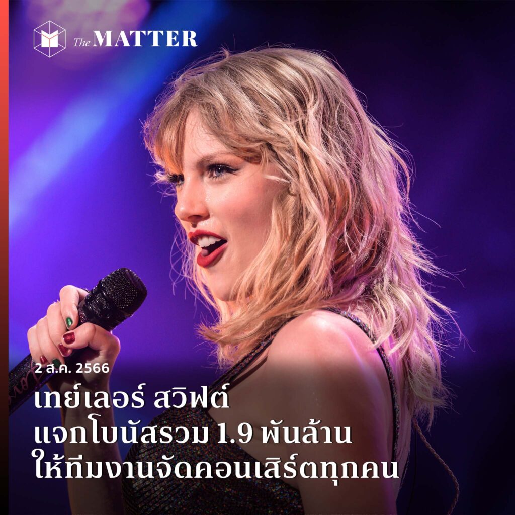 เทเลอร์ สวิฟต์ (Taylor Swift) นักร้องชื่อดังระดับโลก แจกโบนัสรวมทั้งหมดราว 1.9 พันล้านให้พนักงานทุกคนที่มีส่วนในทัวร์คอนเสิร์ต ไม่ว่าจะพนักงานครัว คนขับรถบรรทุก แดนเซอร์ ช่างเสียง และช่างไฟ ตลอดจนพนักงานที่ทำหน้าที่อื่นๆ