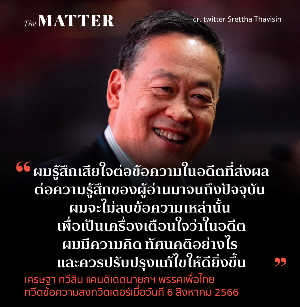 หลังจาก เศรษฐา ทวีสิน แคนดิเดตนายกฯ จากพรรคเพื่อไทยถูกชาวเน็ตขุดคุ้ยทวีตเก่าๆ ที่เคยลงไว้เมื่อก่อน ซึ่งบางข้อความมีการพูดถึงการทำงานของพนักงานต้อนรับบนสายการบินไทย ล่าสุดเขาได้ทวีตข้อความขอโทษต่อการแสดงความเห็นดังกล่าว แต่ยืนยันไม่ลบเพราะอยากเก็บไว้เตือนตัวเอง เขาทวีตข้อความทั้งหมด ดังนี้