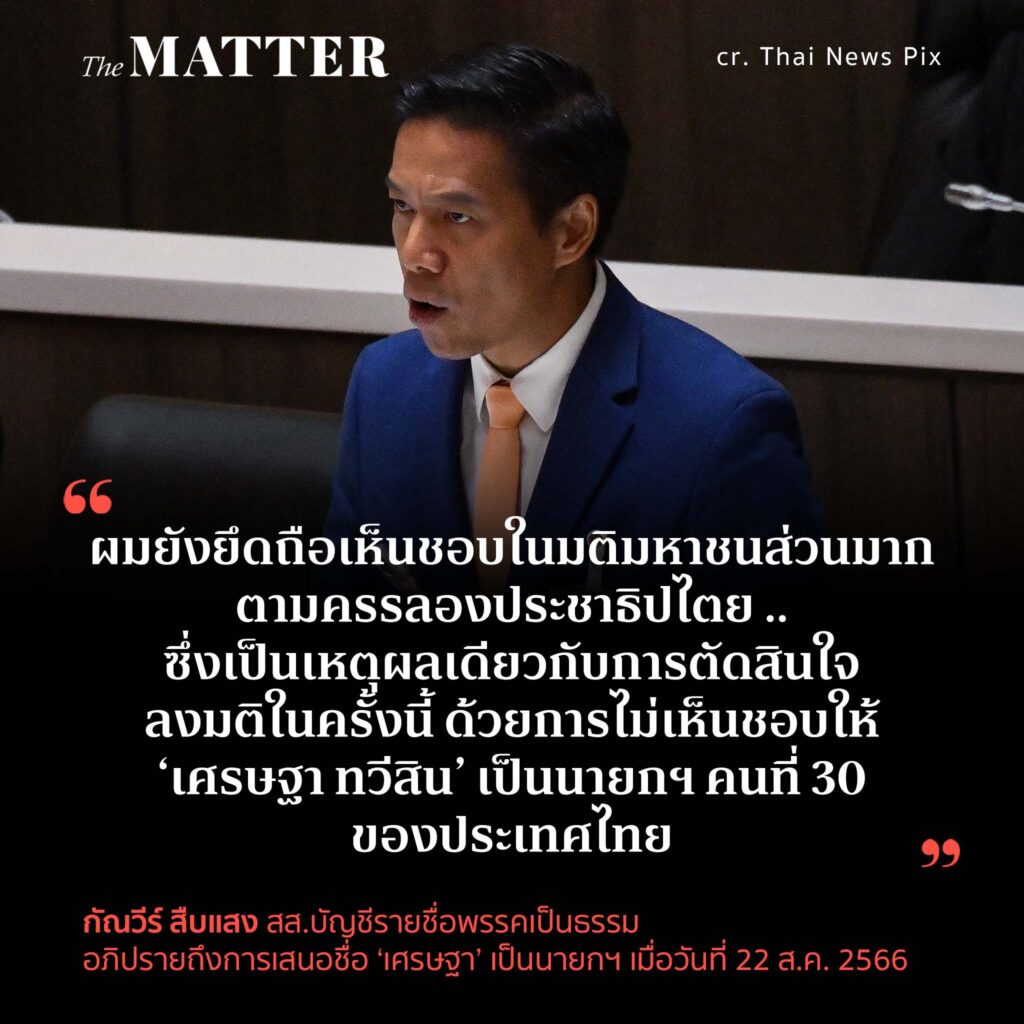 “ผมยังยึดถือเห็นชอบในมติมหาชนส่วนมากตามครรลองประชาธิปไตย .. ซึ่งเป็นเหตุผลเดียวกับการตัดสินใจลงมติในครั้งนี้ ด้วยการไม่เห็นชอบให้ ‘เศรษฐา ทวีสิน’ เป็นนายกฯ คนที่ 30 ของประเทศไทย”