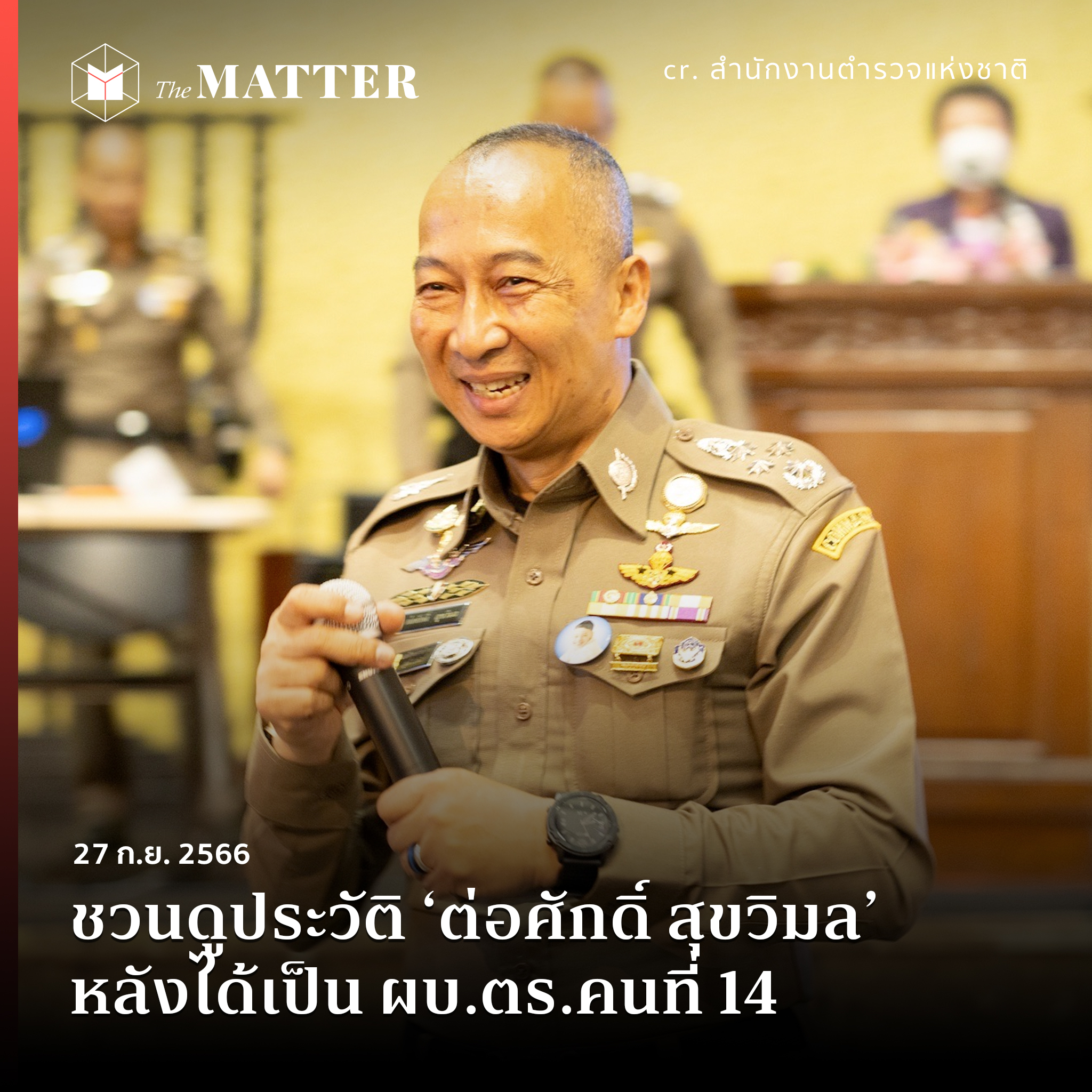 สำนักข่าวหลายแห่งรายงานตรงกันว่า วันนี้ (27 กันยายน) ที่ประชุมคณะกรรมการข้าราชการตำรวจ (ก.ตร.) ซึ่งมี เศรษฐา ทวีสิน นายกรัฐมนตรีและรัฐมนตรีว่าการกระทรวงการคลัง เป็นประธาน ได้มีมติ เลือก ‘พล.ต.อ.ต่อศักดิ์ สุขวิมล’ เป็นผู้บัญชาการตำรวจแห่งชาติ (ผบ.ตร.) คนที่ 14