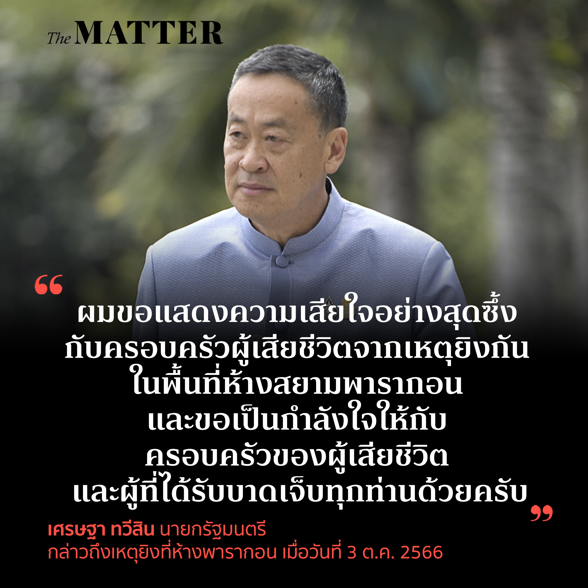 QUOTE: “ผมขอแสดงความเสียใจอย่างสุดซึ้งกับครอบครัวผู้เสียชีวิตจากเหตุยิงกันในพื้นที่ห้างสยามพารากอน และขอเป็นกำลังใจให้กับครอบครัวของผู้เสียชีวิต และผู้ที่ได้รับบาดเจ็บทุกท่านด้วยครับ”