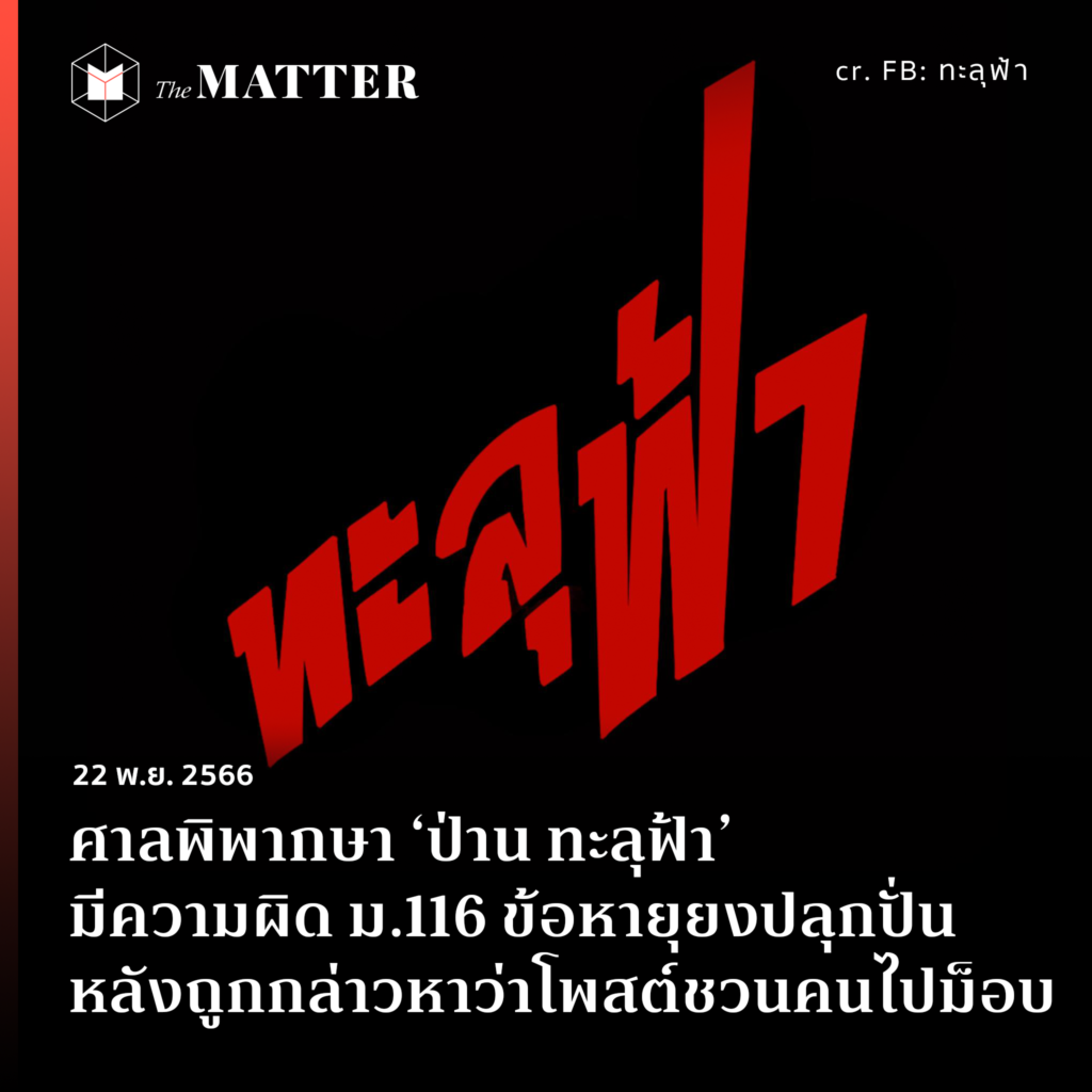 วันนี้ (22 พฤศจิกายน) ศาลอาญาพิพากษาว่า ป่าน—กตัญญู หมื่นคำเรือง จากกลุ่ม ‘ทะลุฟ้า’ มีความผิดตามประมวลกฎหมายอาญา มาตรา 116 หรือความผิดฐานยุยงปลุกปั่น จากเหตุโพสต์เชิญชวนประชาชนไปร่วมชุมนุม 2 โพสต์ โดยศาลพิพากษาจำคุก 2 ปี ไม่รอลงอาญา ขณะนี้อยู่ระหว่างยื่นประกันตัวในชั้นอุทธรณ์