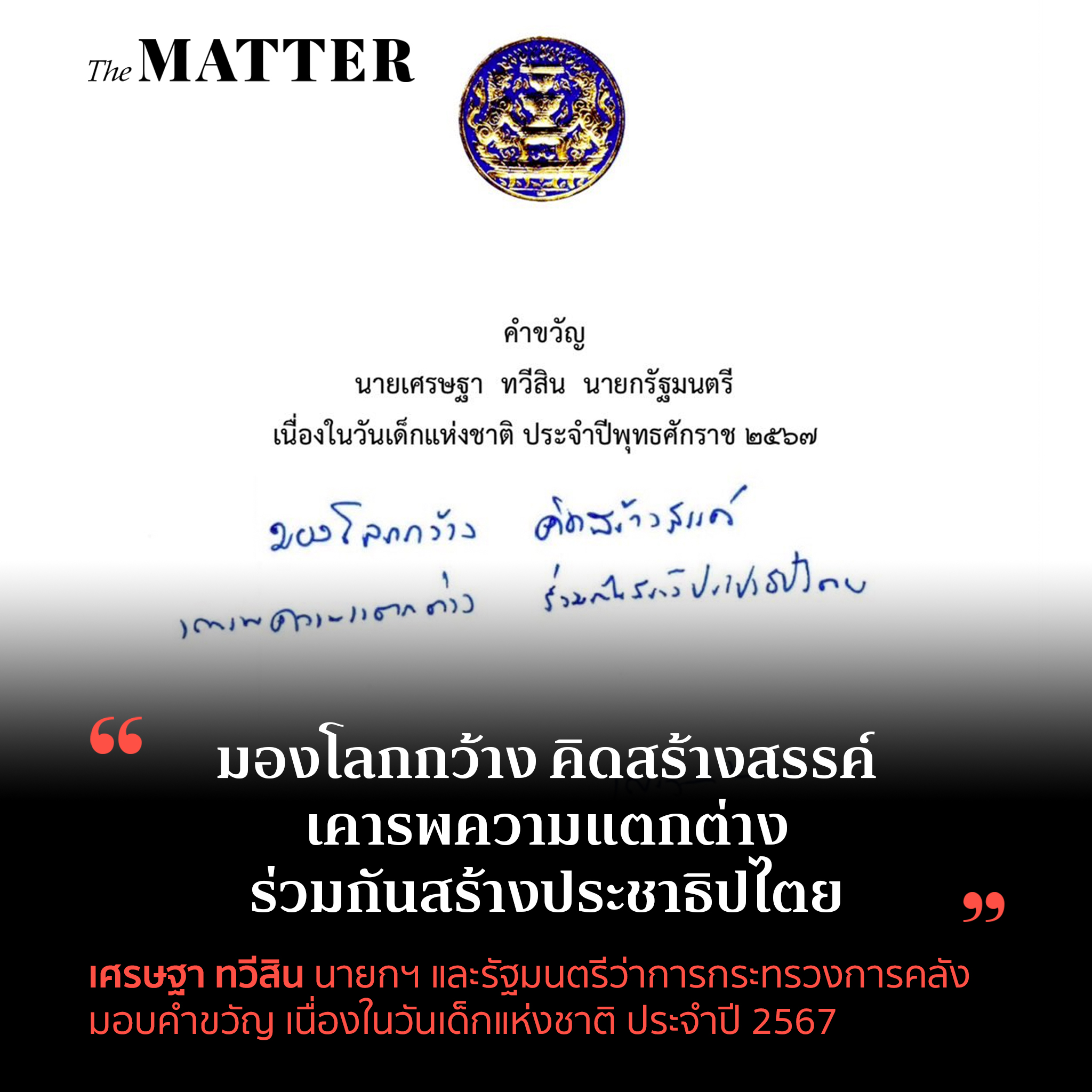 เศรษฐา ทวีสิน นายกฯ และรัฐมนตรีว่าการกระทรวงการคลัง มอบคำขวัญ เนื่องในวันเด็กแห่งชาติ ประจำปี 2567 ว่า “มองโลกกว้าง คิดสร้างสรรค์ เคารพความแตกต่าง ร่วมกันสร้างประชาธิปไตย”