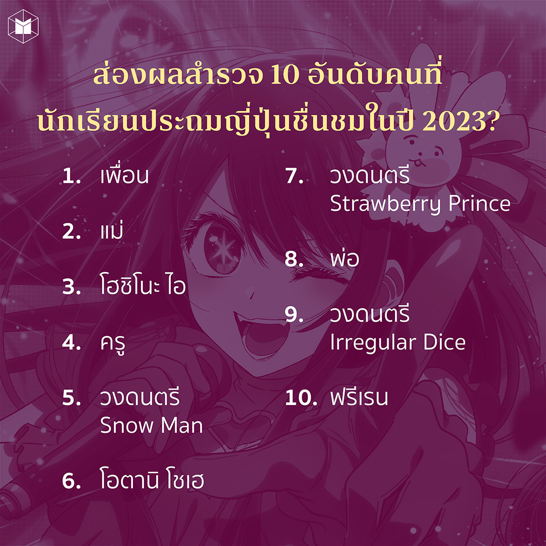 สำหรับคออนิเมะ การเห็นชื่อบางชื่อโฮชิโนะ ไอ ตัวละครสำคัญของซีรีส์การ์ตูน Oshi No Ko ได้รับความชมชอบอยู่เหนือคนเช่นครูหรือพ่อ น่าจะสร้างความแปลกใจให้เราได้บ้าง โดยเหตุผลที่ทำให้พวกเขาชื่นชมในไอดอลสาว 2D นี้เนื่องมาจาก “ความสามารถในการร้องเพลงและเต้น” “ความน่ารัก มุมมองชีวิตแง่บวก และความสามารถ” และ “ความใส่ใจคนรอบตัว” ผลสถิตินั้นๆ กำลังบอกอะไรเรากับสังคมที่เก็บมัน?
