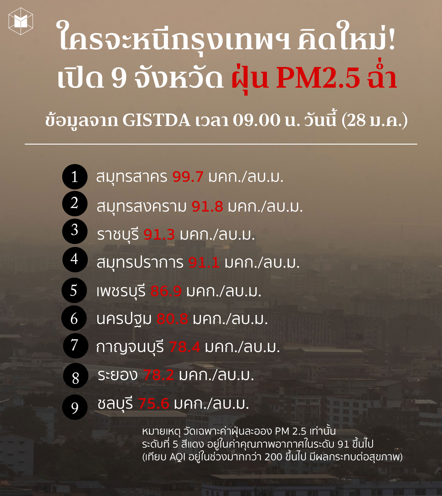 ด้วยสถานการณ์ฝุ่น PM 2.5 แบบรายชั่วโมง ที่รายงานจากดาวเทียมผ่านแอปพลิเคชั่นเช็คฝุ่น ของสำนักงานพัฒนาเทคโนโลยีอวกาศและภูมิสารสนเทศ (องค์การมหาชน) หรือ GISTDA ในช่วง 9.00 น. วันนี้ (28 มกราคม) ระบุว่า ในพื้นที่ 9 จังหวัดมีค่าฝุ่นเกินเกณฑ์มาตรฐานระดับที่มีผลกระทบต่อสุขภาพสีแดง