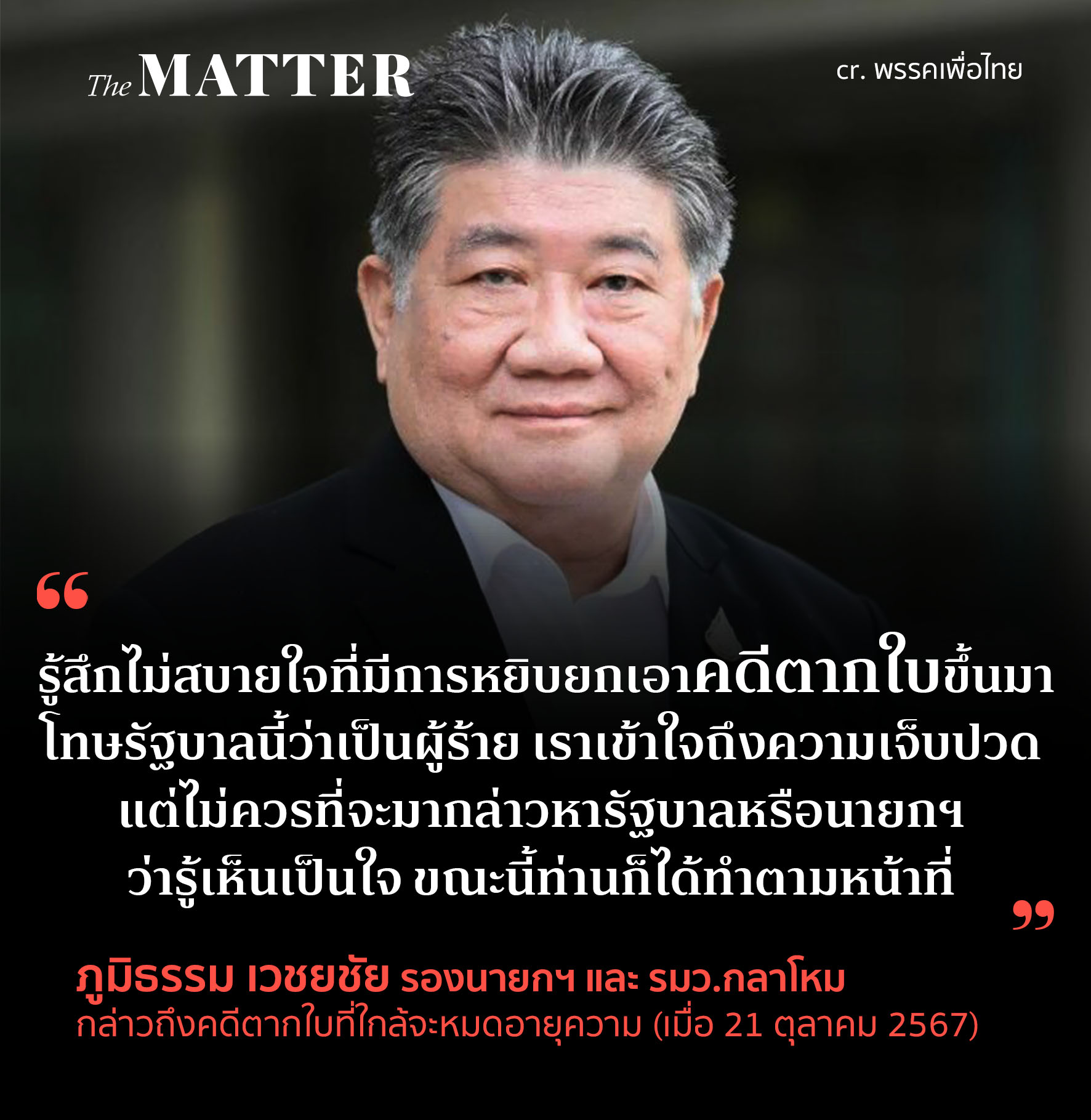 วันนี้ (21 ตุลาคม) ภูมิธรรม เวชยชัย รองนายกรัฐมนตรีและรัฐมนตรีว่าการกระทรวงกลาโหม กล่าวถึงคดีตากใบที่ใกล้จะหมดอายุความในวันที่ 25 ตุลาคม 2567 ว่า เรื่องนี้เป็นเรื่องที่เราเป็นห่วงและเฝ้าระวังอยู่แล้ว แต่จริงๆ แล้วการก่อเหตุในพื้นที่มีมาตลอด ไม่ใช่เพิ่งมามีในช่วงที่มีคดีตากใบ