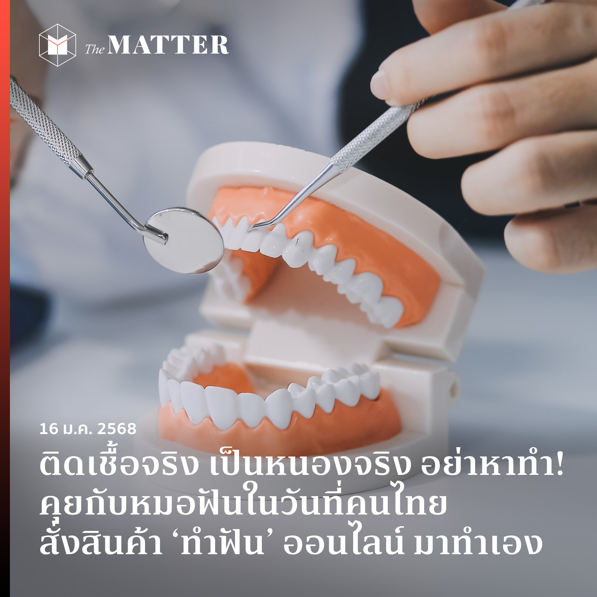 The MATTER ได้ไปพูดคุยกับ อ.ทพ.ดร.ธงชัย วชิรโรจน์ไพศาล อุปนายกทันตแพทยสภา เพื่อทำความเข้าใจถึงอันตรายของสินค้าทันตกรรมออนไลน์ และแนวทางดำเนินการของทันตแพทยสภาเพิ่มเติม